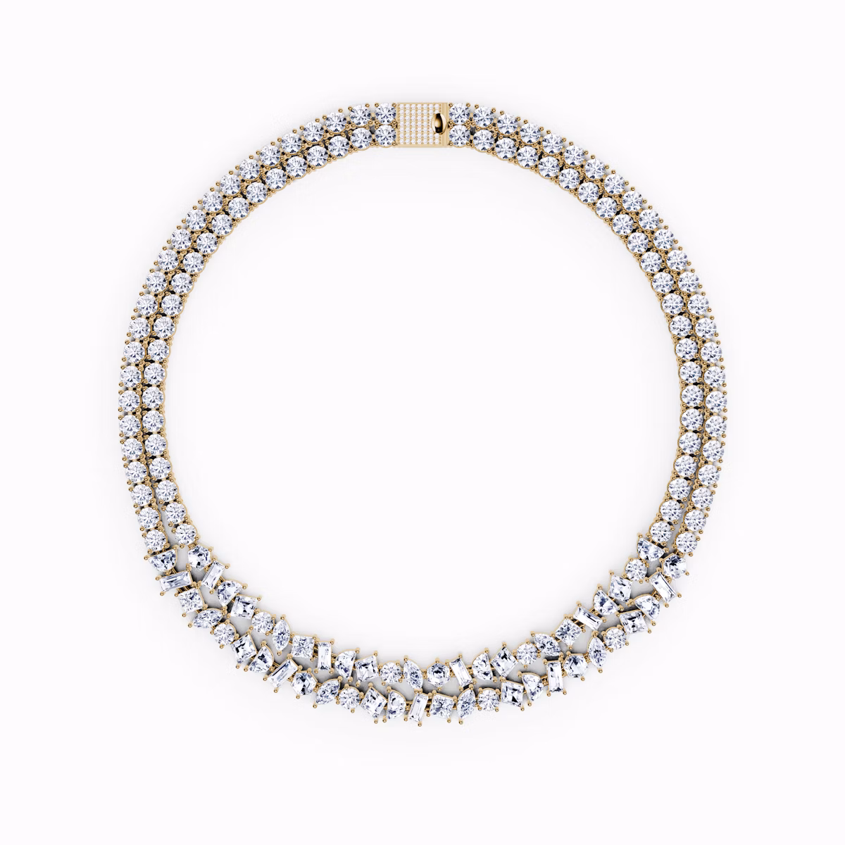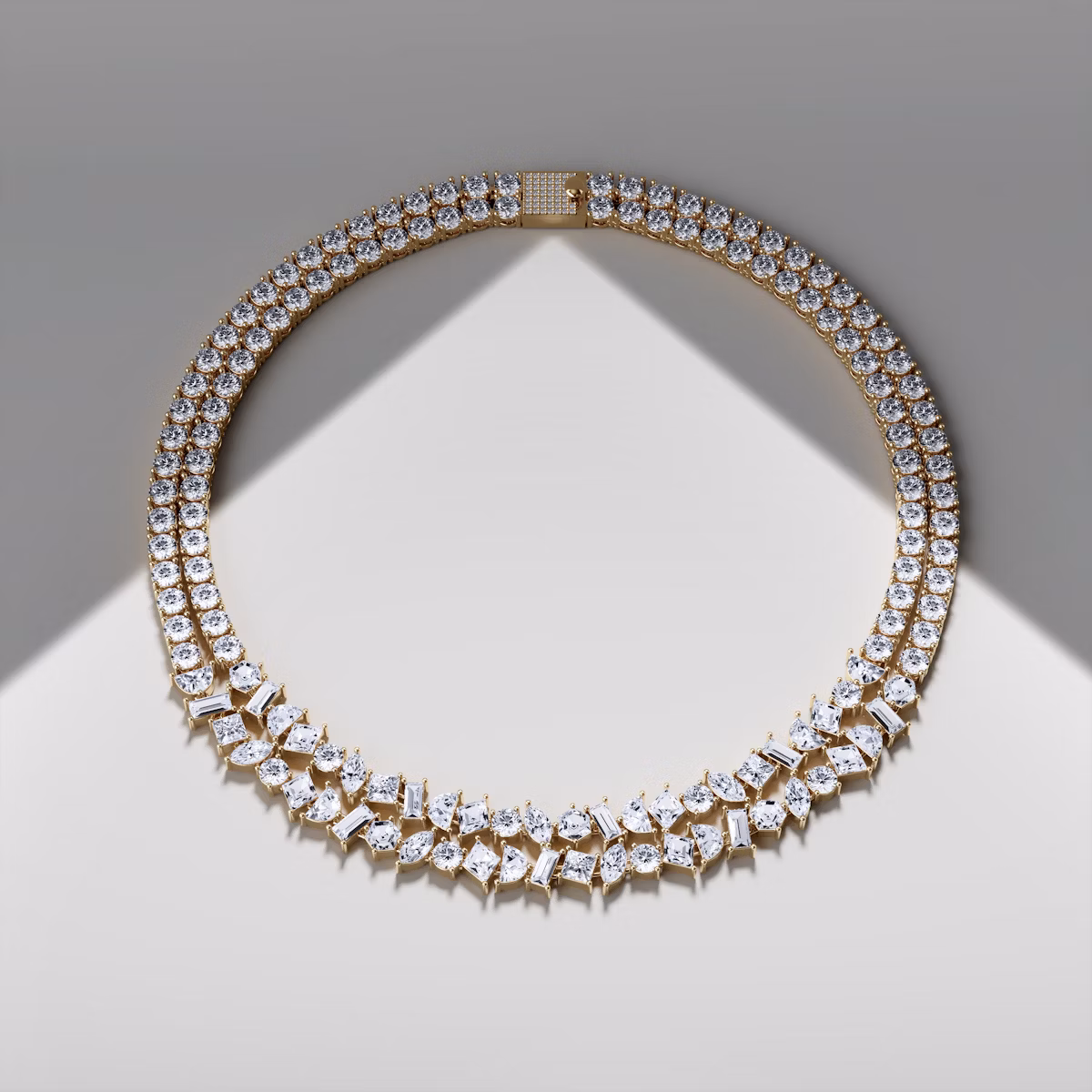 Changing the narrative of diamond creation and design. The Mixed Shape Double Strand Tennis Necklace, created for the 2024 Met Gala, combines VRAI created diamonds in 7 distinctive shapes for a look of opulence without compromise. Set in 14k solid gold with a matching box clasp closure, the double strands drape in perfect harmony for a statement-making effect.