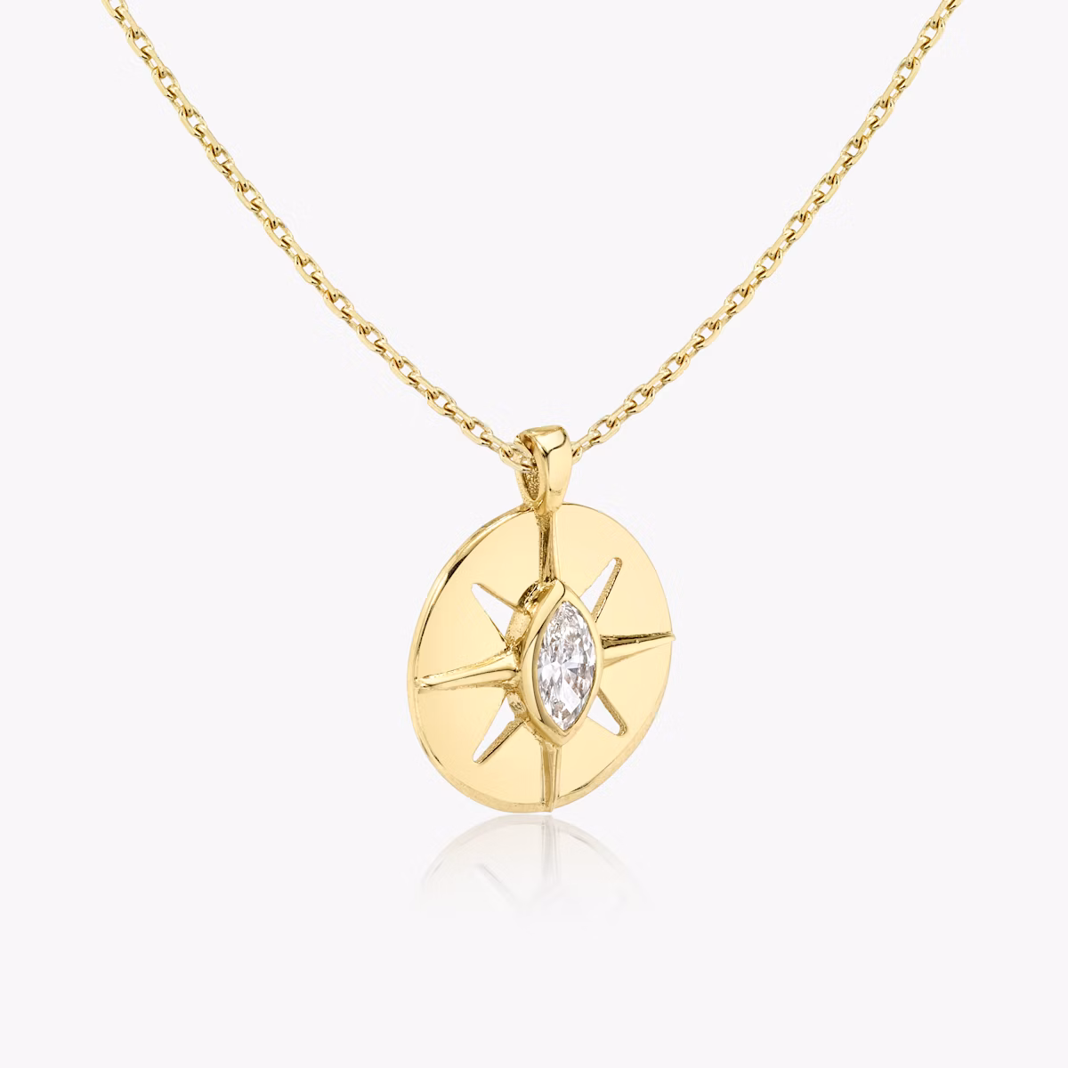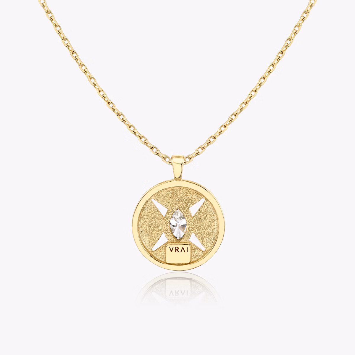 Our Intentions Medallion is a modern interpretation of a classic compass design. The recycled 14k solid yellow gold medallion, featuring cardinal points and a VRAI created marquise diamond at its center, guides you towards your purpose as you set your intentions daily.