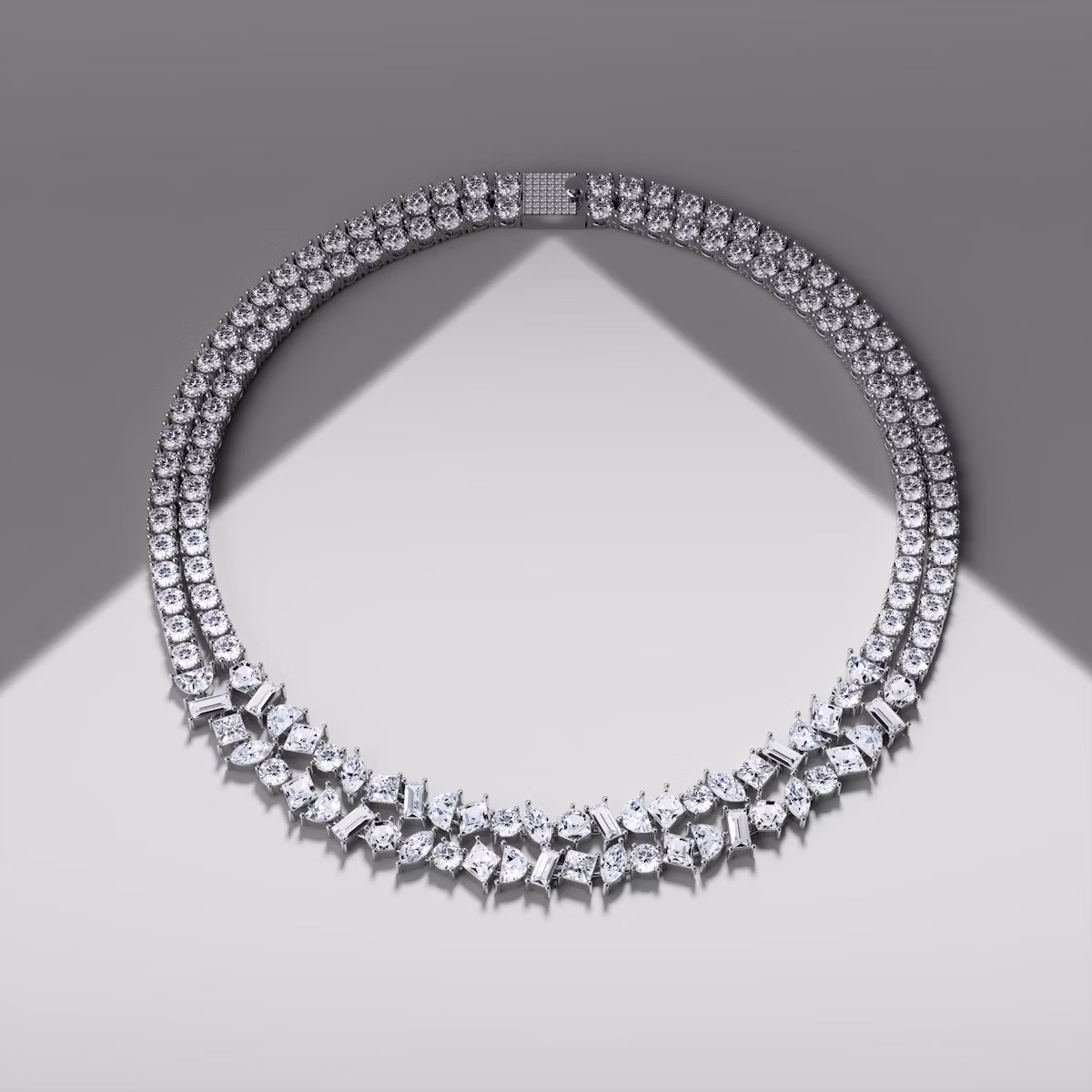 Changing the narrative of diamond creation and design. The Mixed Shape Double Strand Tennis Necklace, created for the 2024 Met Gala, combines VRAI created diamonds in 7 distinctive shapes for a look of opulence without compromise. Set in 14k solid gold with a matching box clasp closure, the double strands drape in perfect harmony for a statement-making effect.