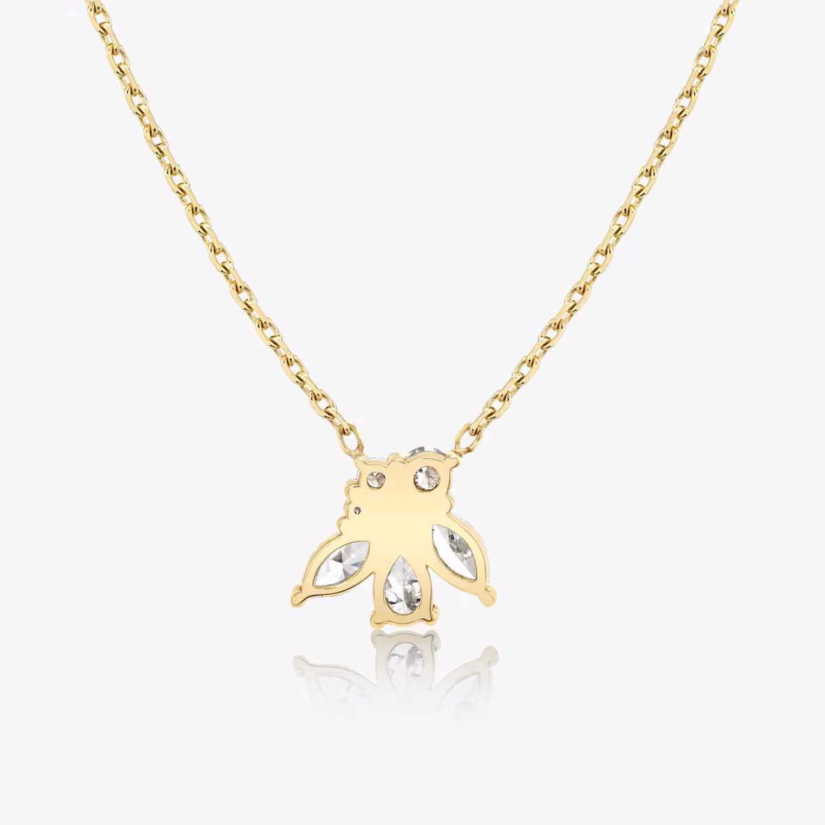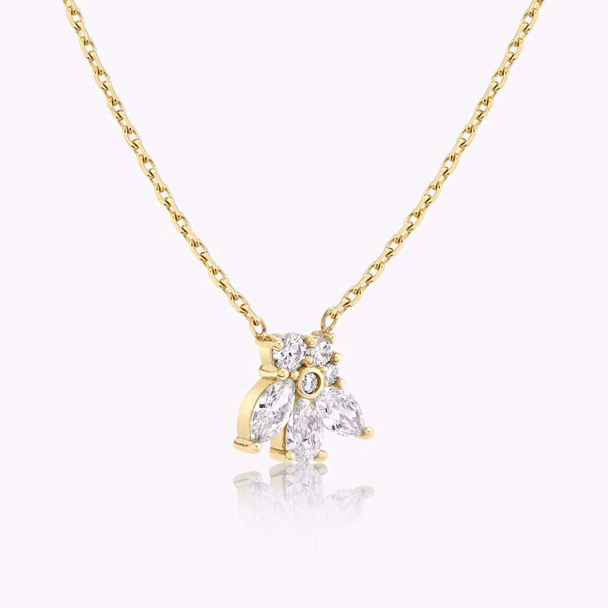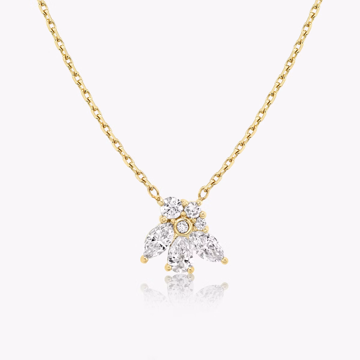 Seven VRAI created diamonds in three distinct shapes form an abstract bloom designed to be cherished year after year. The Perennial Necklace inventive 14k solid yellow gold setting with matching chain holds each diamond petal securely in place.