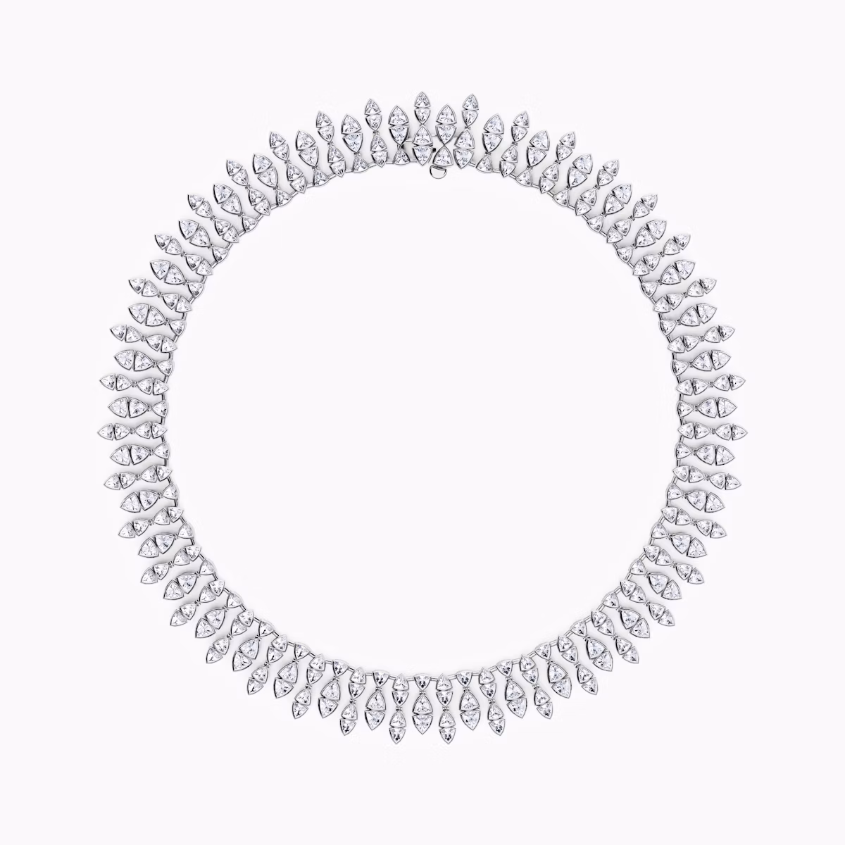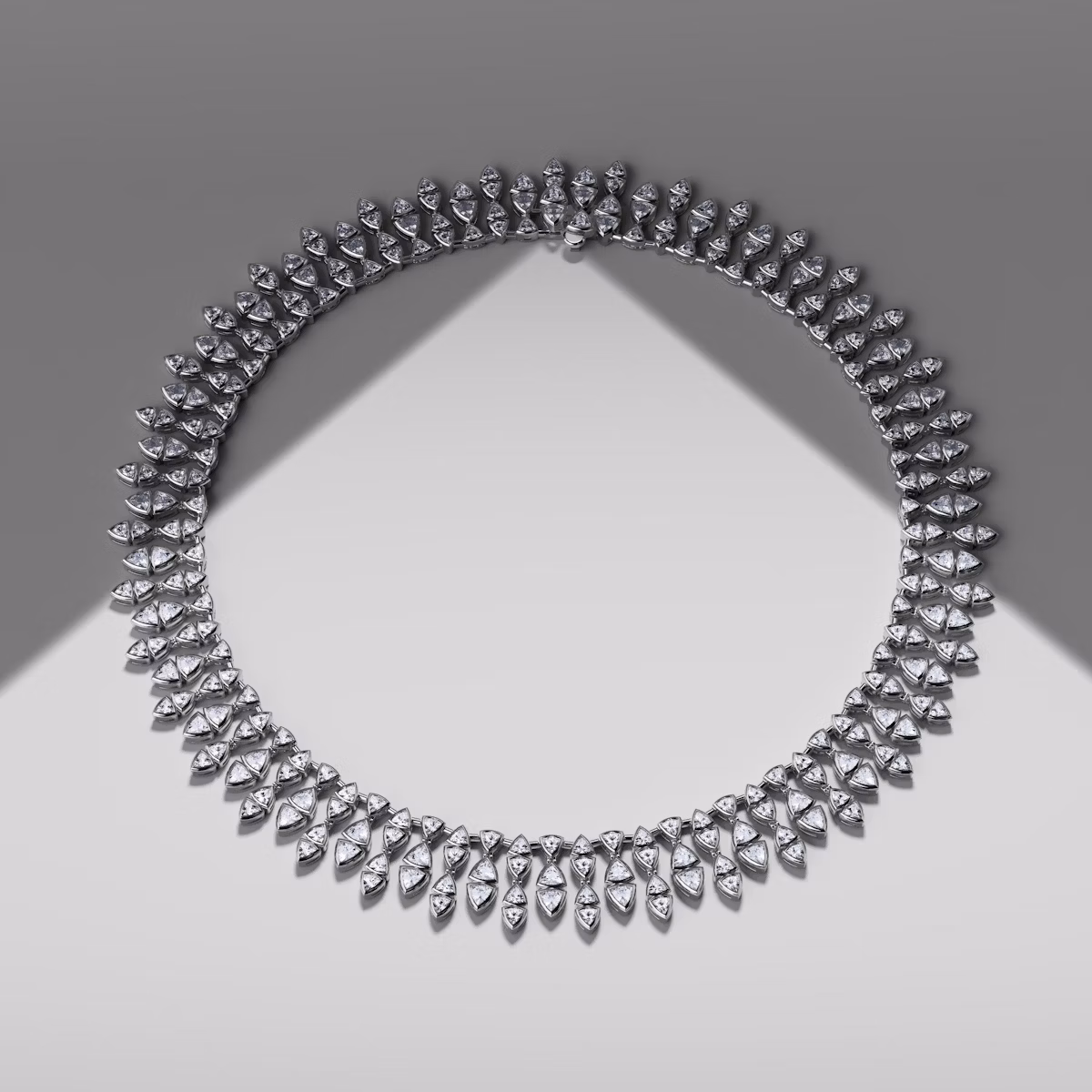 An ode to sky, land, and sea, the Trillion Cascade Necklace is a design inspired by nature and made to cascade in every direction. Created for the 2024 Met Gala, an endless array of Trillion cut VRAI created diamonds are handset in a 14k solid gold setting to form geometric rows that gently descend along your neckline to dramatic effect.