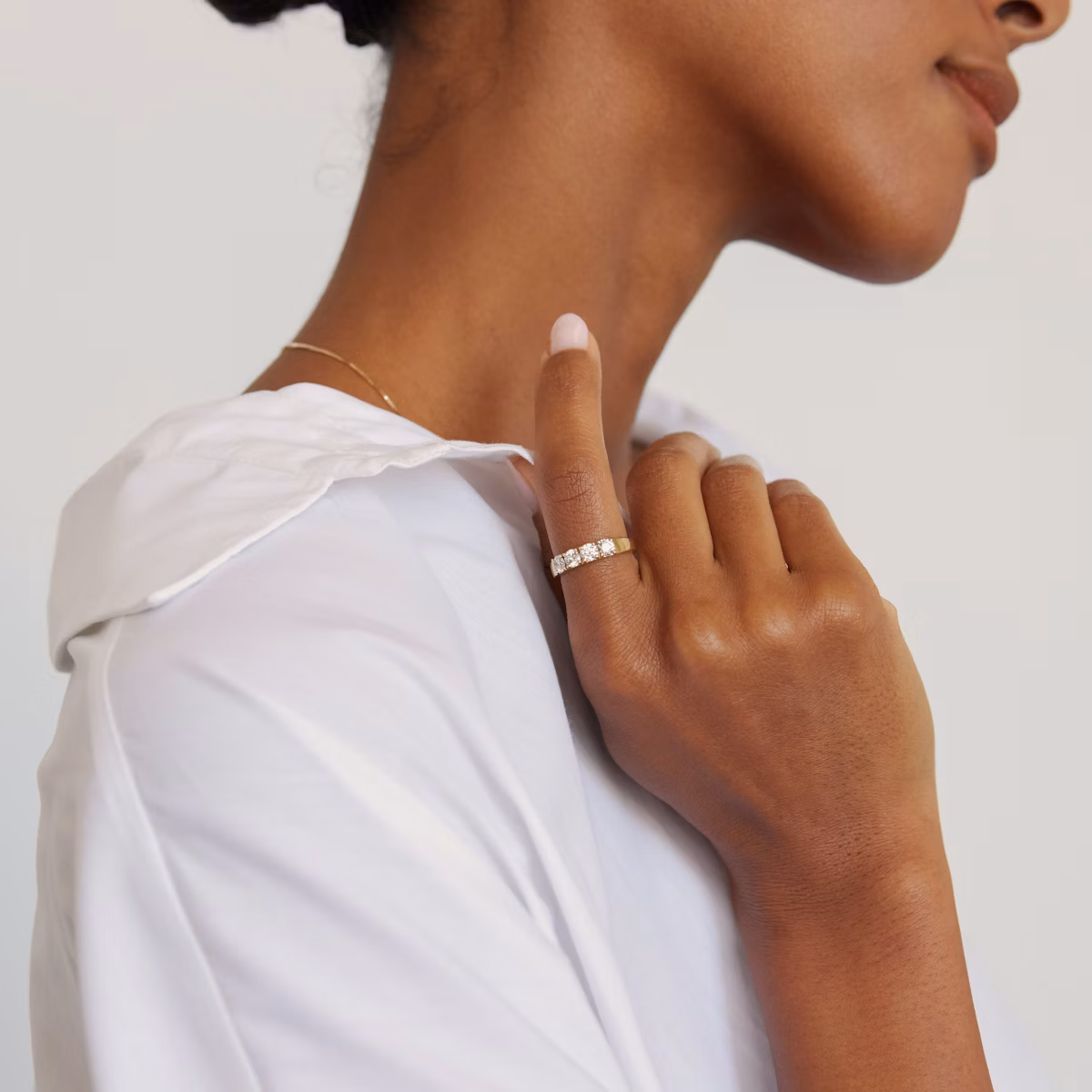 Framed in 14k solid gold, our Diamond Tetrad features a series of four diamonds, balancing symmetry and substance. Each diamond’s facets creates depth and dimension, while an open back gallery draws in light and spotlights clarity.