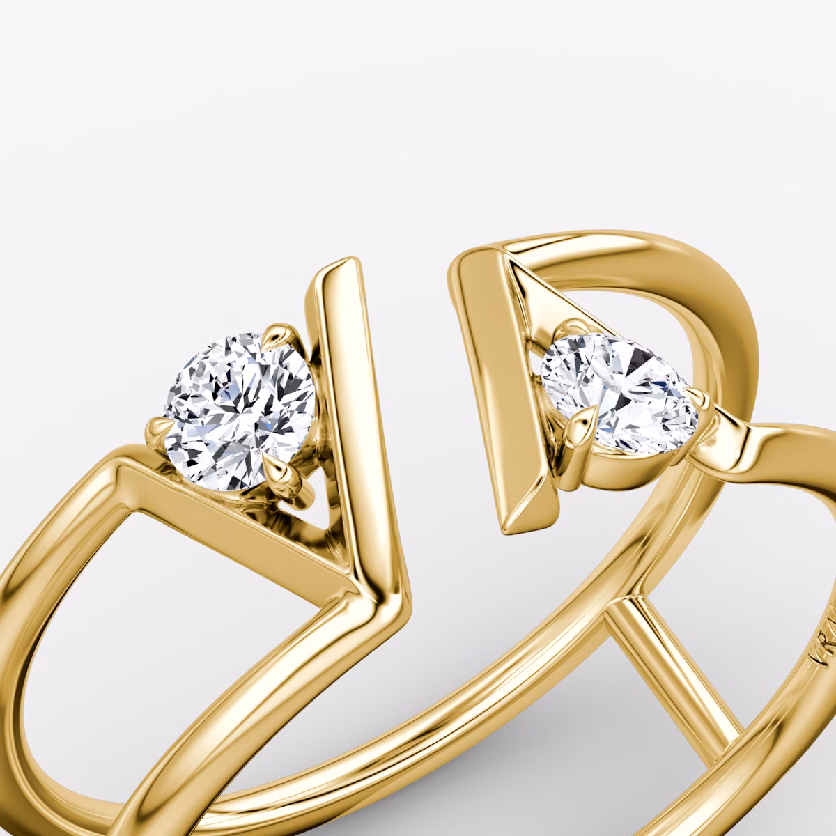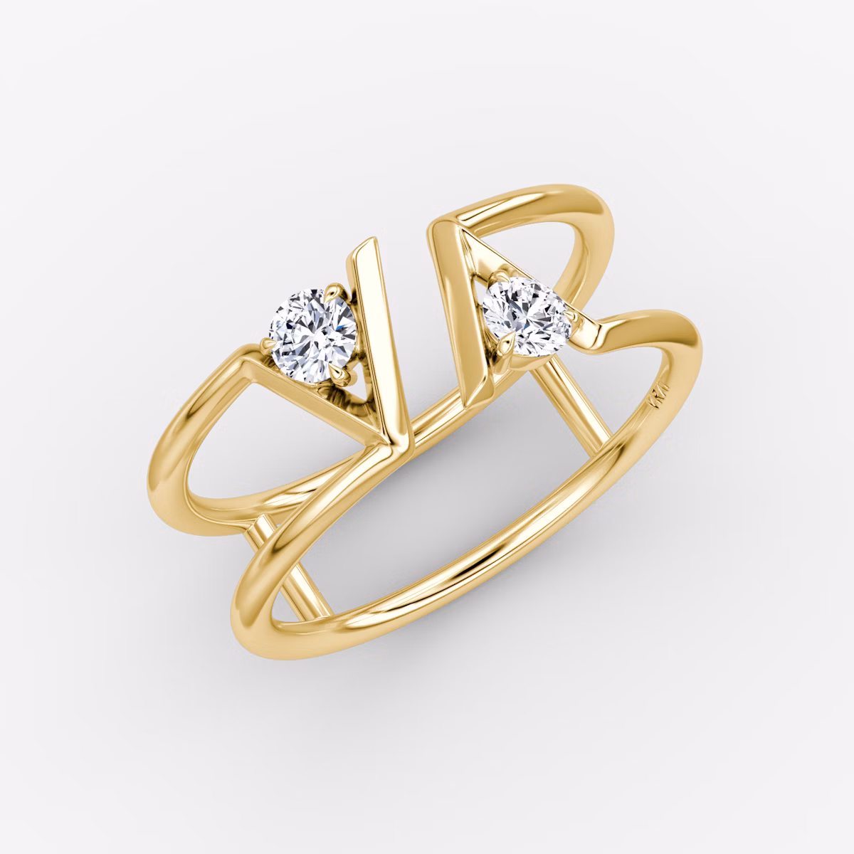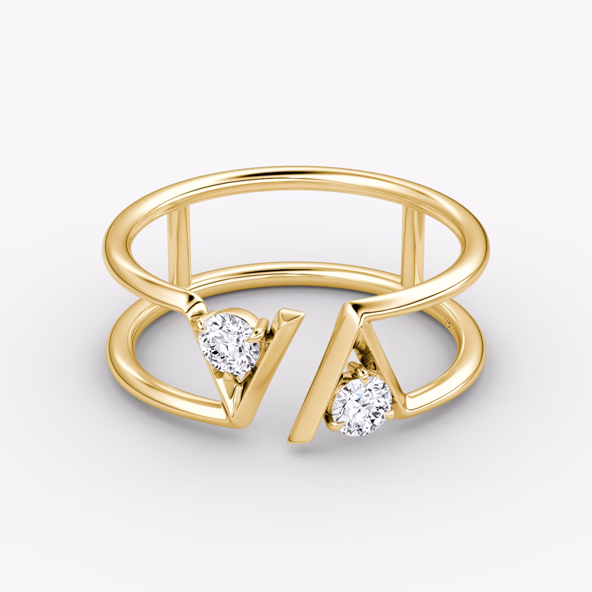 A statement piece made to stand alone or layer, but always set you apart. The VRAI V Double Row Band in 14k solid gold features a duo of knife-edge Vs with matching 3-prong settings that lift and secure Round Brilliant VRAI created diamonds in place. Make this innovative design your own in plain or pavé styles.