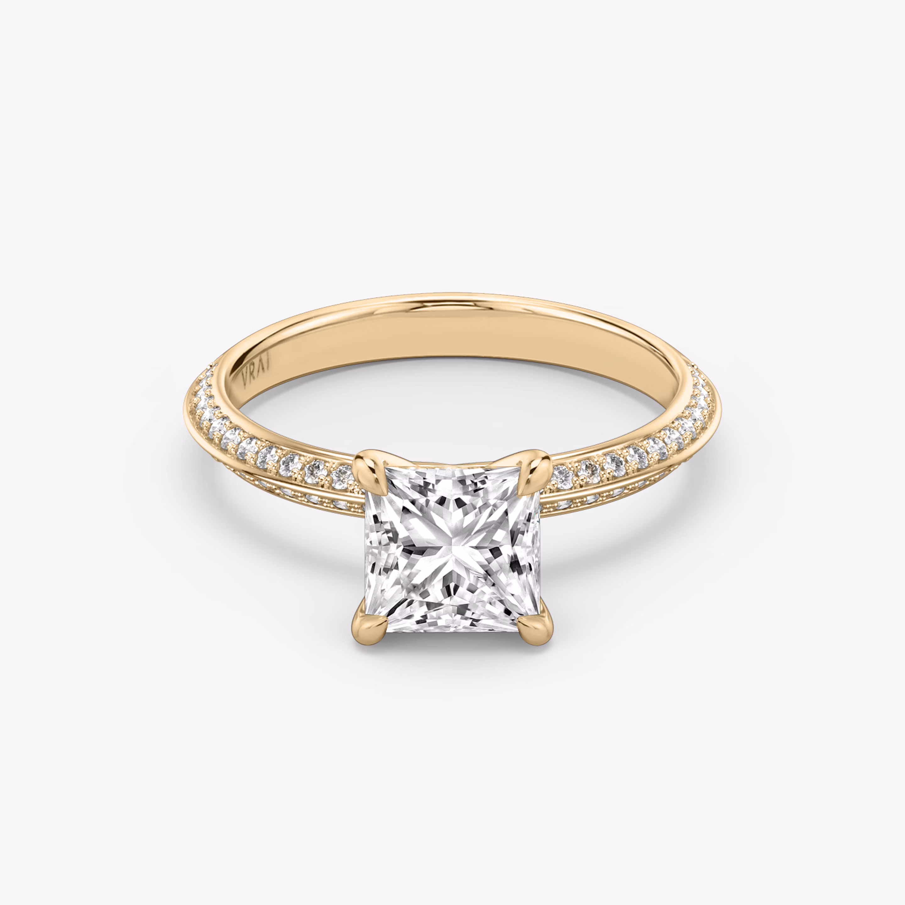 Princess cut diamonds first appeared in the late 20th century and steadily grew in popularity as a center stone. Because of their square length-to-width ratio, Princess cut diamonds can actually appear smaller than most diamond shapes of the same carat weight. But their large table can occasionally make them seem slightly larger than a Round Brilliant. A 1 carat Princess cut diamond engagement ring creates a look of modern sophistication and elegance.