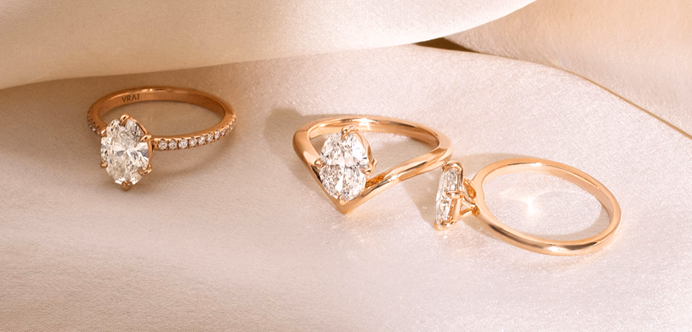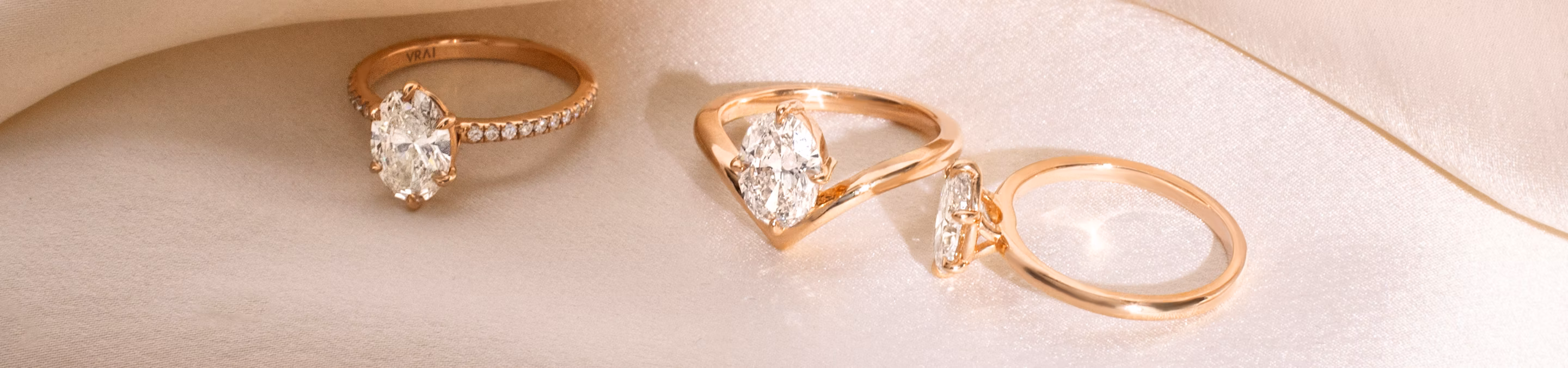 Rose gold, like all 14k solid gold, is made of 14 parts pure gold and 10 parts other alloy — most often copper. More copper results in a more pronounced red color. All of VRAI’s rose gold rings, from engagement rings to wedding bands, are composed of 58.5% gold and 41.5% copper. Which rosy ring would you choose?