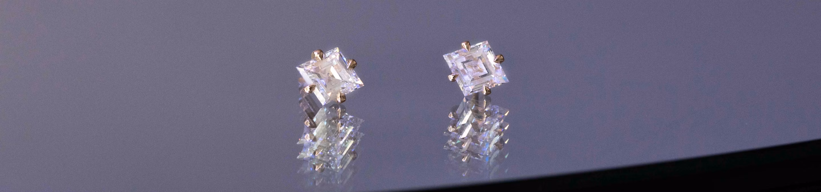 Lozenge, Hexagon, and Shield Cut Diamonds are all step-cut diamonds with larger, trapezoidal step-cut facets that create a hall-of-mirror effect. The Lozenge cut diamond has a rhomboid shape, the Hexagon is, true to its name, hexagon-shaped, while the Shield diamond has a somewhat triangular shape with the top side bowed and the two other sides composed of two bowed edges. While Lozenge and Hexagon cuts have been extensively used as center diamonds, Shield diamonds are mostly seen set in dangle earrings and pendants.