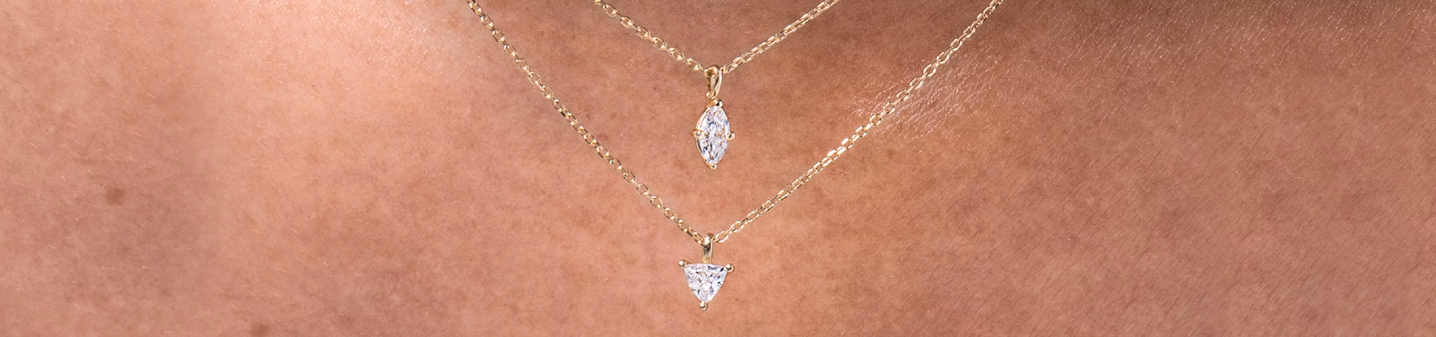 Solitaire necklaces feature an individual diamond in a four-prong setting. The setting also features an open back gallery inviting light in from all angles for maximum brilliance. This style perfectly complements Round diamonds, or and Ovals, Emeralds, and Marquises in an East-West setting. Consider getting the same diamond shape in two different carat weights, or two different diamond shapes that better reflect the style of both the mother and the daughter.