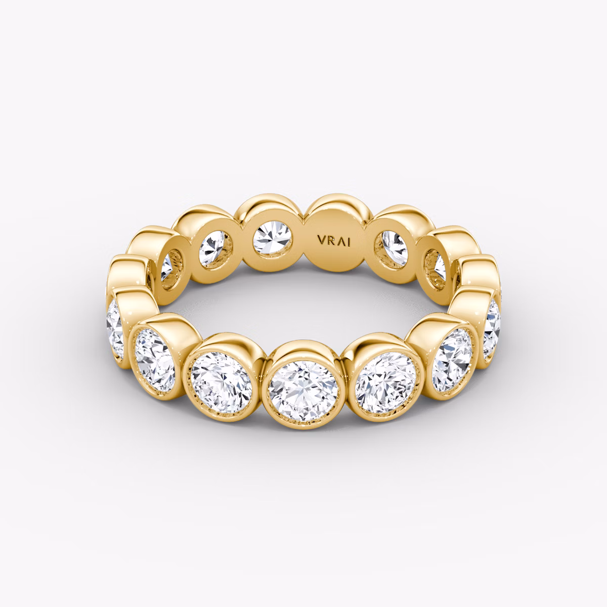 A vintage-inspired twist with modern appeal that is timelessly elegant. A platinum or solid gold bezel setting outlines an endless array of VRAI created diamonds in a design made to commemorate an eternity of love.
