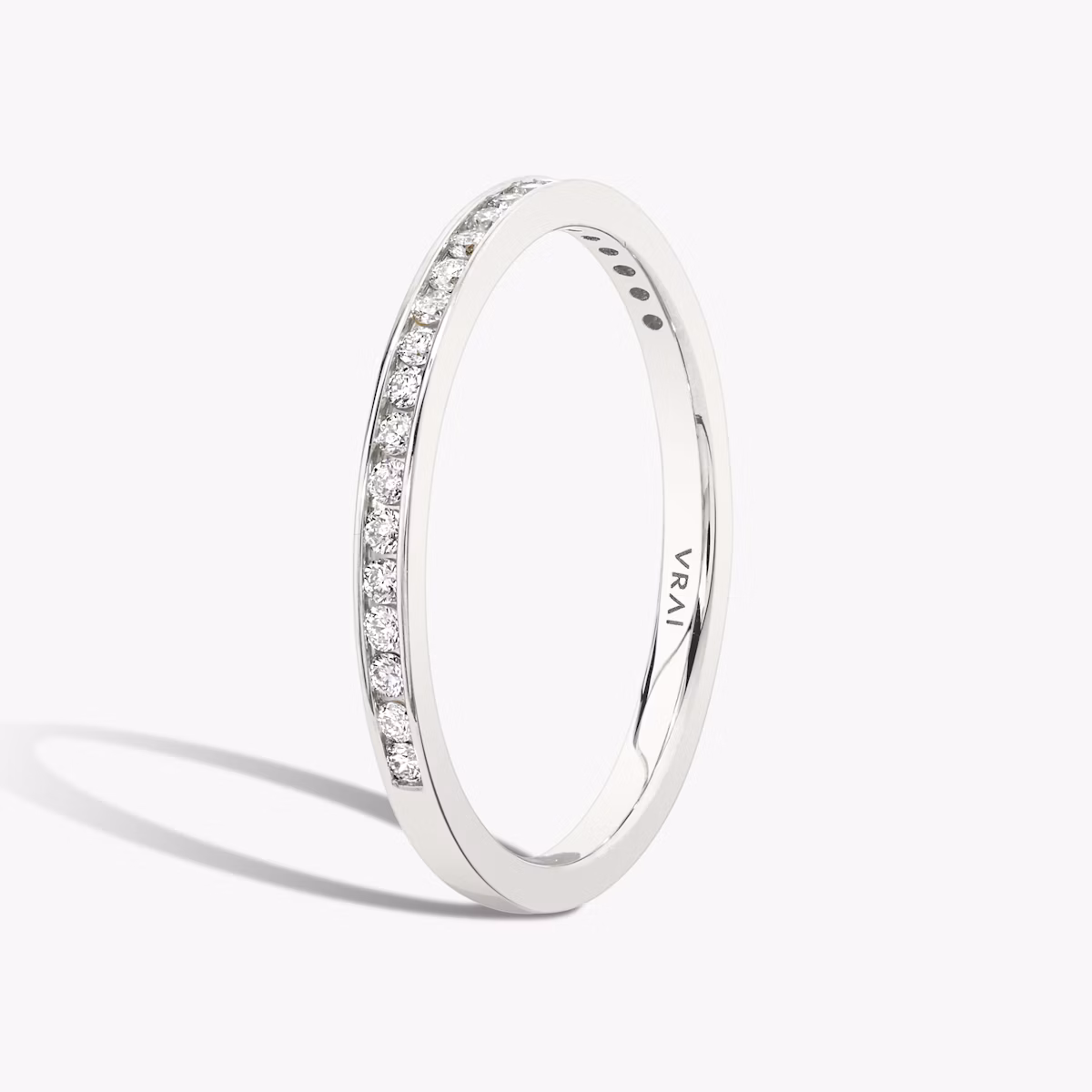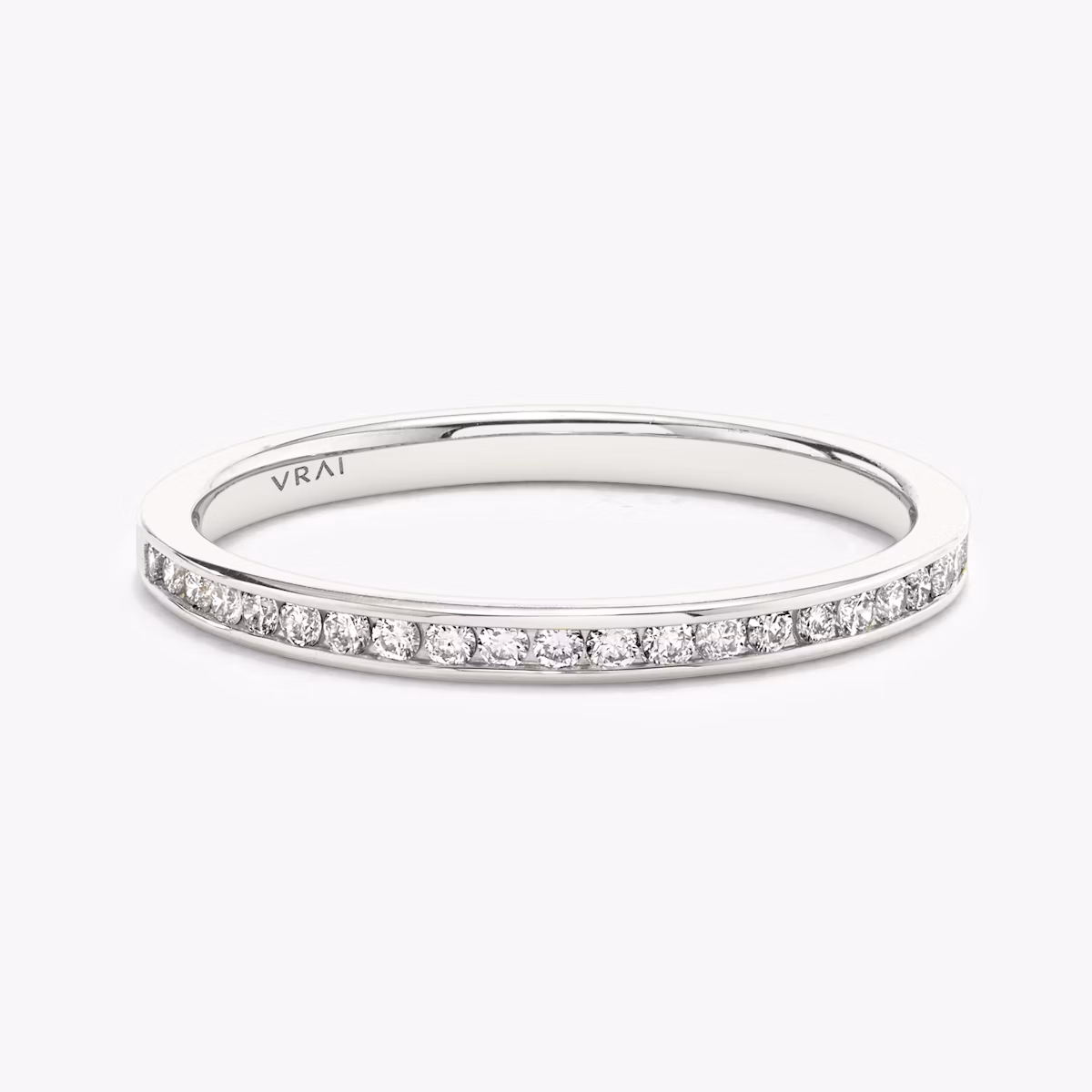 Commemorate your love to another or to yourself with a band that is a daily reminder of your devotion. A series of VRAI created Round Brilliant or Baguette shaped diamonds are secured inside a platinum or solid gold channel set band, creating a look of enduring sophistication.