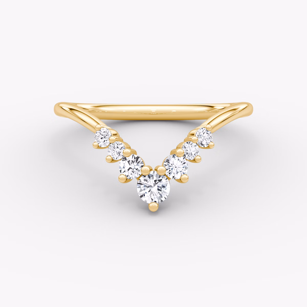 An array of pavé set VRAI created diamonds highlight the band’s shape and form delicate dew drops around its distinctive point. Crafted to “crown” your wedding ring set or wear alone, this design can be worn with the V facing either direction and sits flush with our Signature V engagement ring.</a>