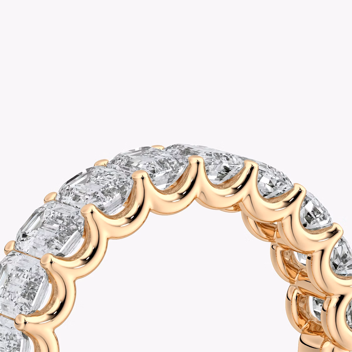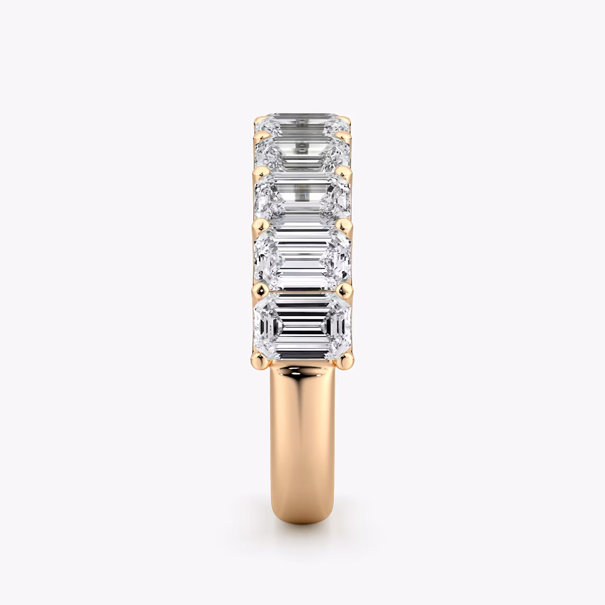 Let your love shine forever with the dazzling and symbolic Eternity Band. The Half Emerald Eternity Band provides a slightly more subdued, but equally romantic, alternative to our classic design. Choose between 2.5 or 4 carats of VRAI created Emerald cut diamonds that encircle half of a platinum or solid gold band. This wedding band design beautifully represents the strength of your union and your never-ending love.