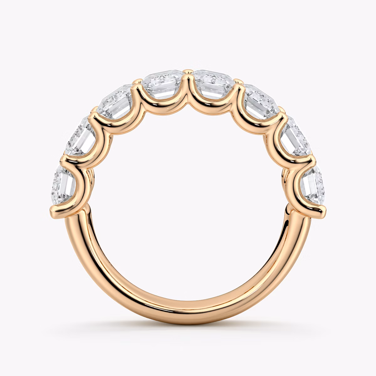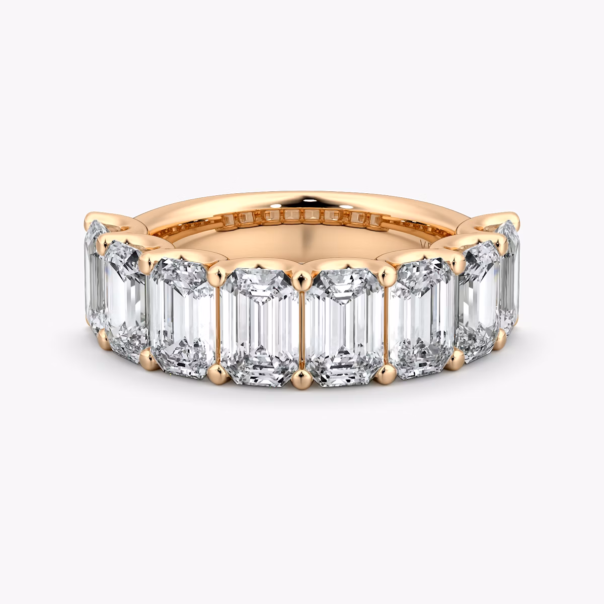 Let your love shine forever with the dazzling and symbolic Eternity Band. The Half Emerald Eternity Band provides a slightly more subdued, but equally romantic, alternative to our classic design. Choose between 2.5 or 4 carats of VRAI created Emerald cut diamonds that encircle half of a platinum or solid gold band. This wedding band design beautifully represents the strength of your union and your never-ending love.