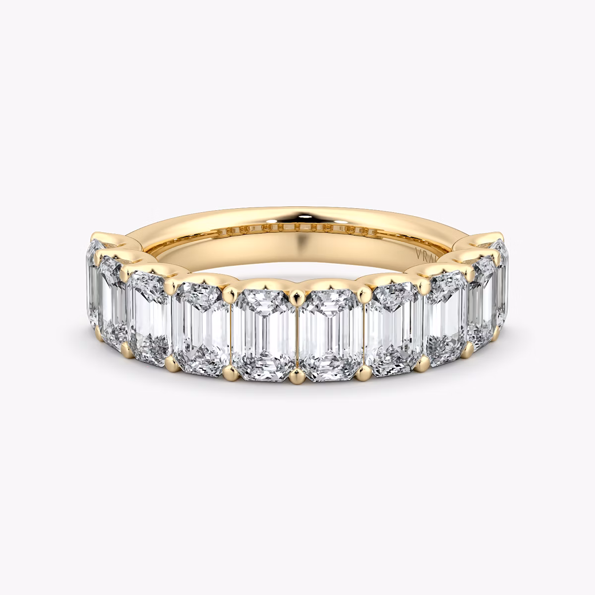 Let your love shine forever with the dazzling and symbolic Eternity Band. The Half Emerald Eternity Band provides a slightly more subdued, but equally romantic, alternative to our classic design. Choose between 2.5 or 4 carats of VRAI created Emerald cut diamonds that encircle half of a platinum or solid gold band. This wedding band design beautifully represents the strength of your union and your never-ending love.