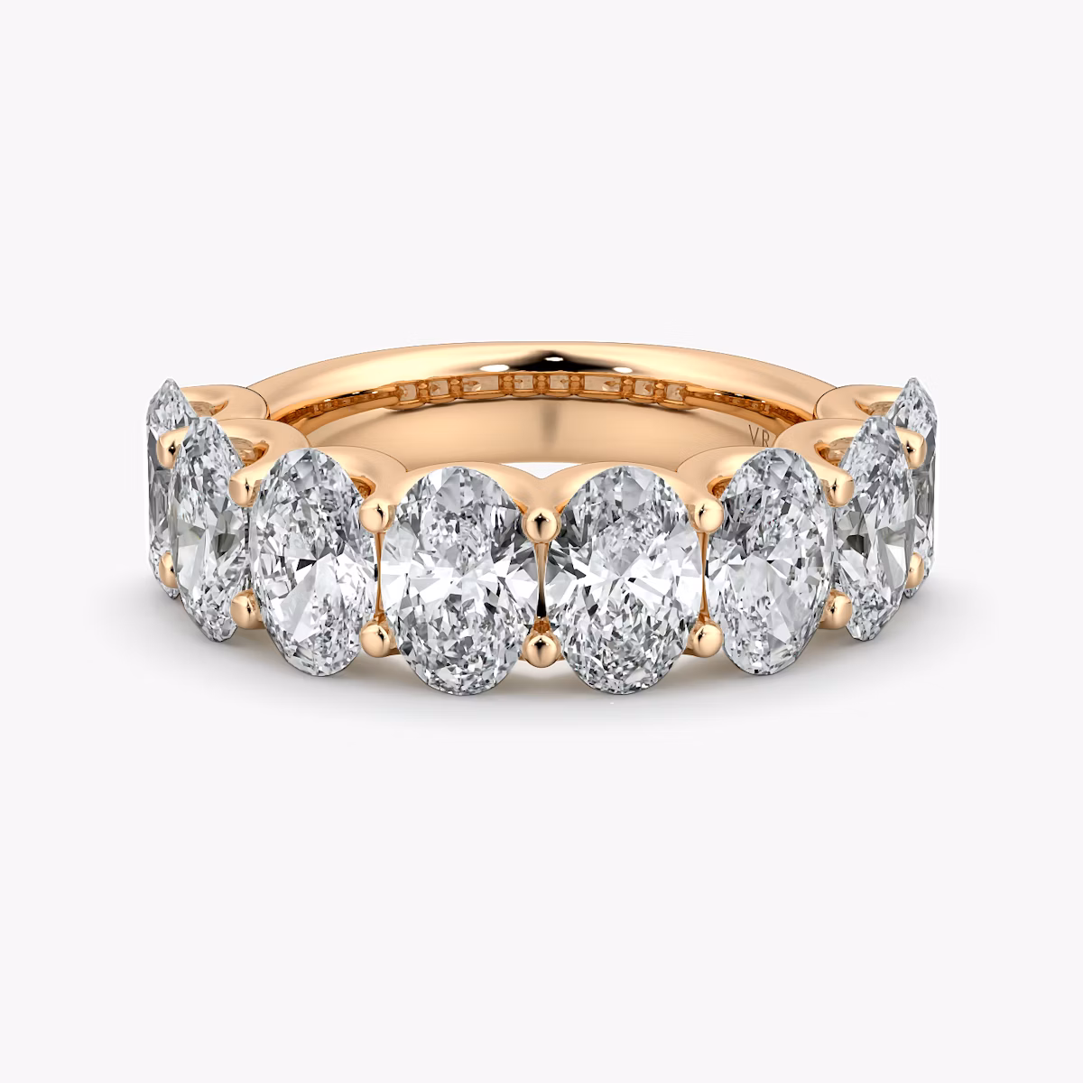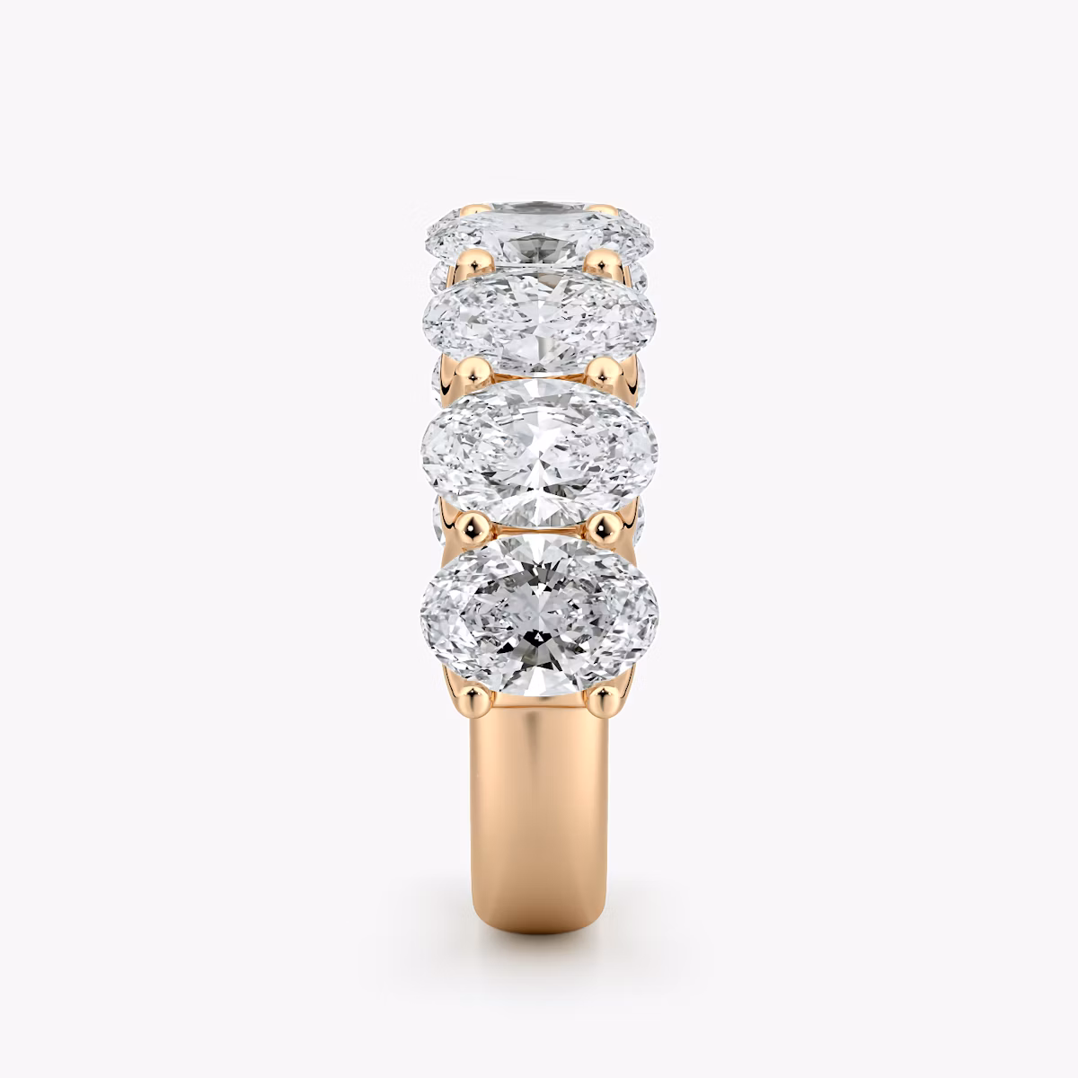 Let your love shine forever with the dazzling and symbolic Eternity Band. The Half Oval Eternity Band provides a slightly more subdued, but equally romantic, alternative to our classic design. Choose between 2.5 or 4 carats of VRAI created Oval cut diamonds that encircle half of a platinum or solid gold band. This wedding band design beautifully represents the strength of your union and your never-ending love.