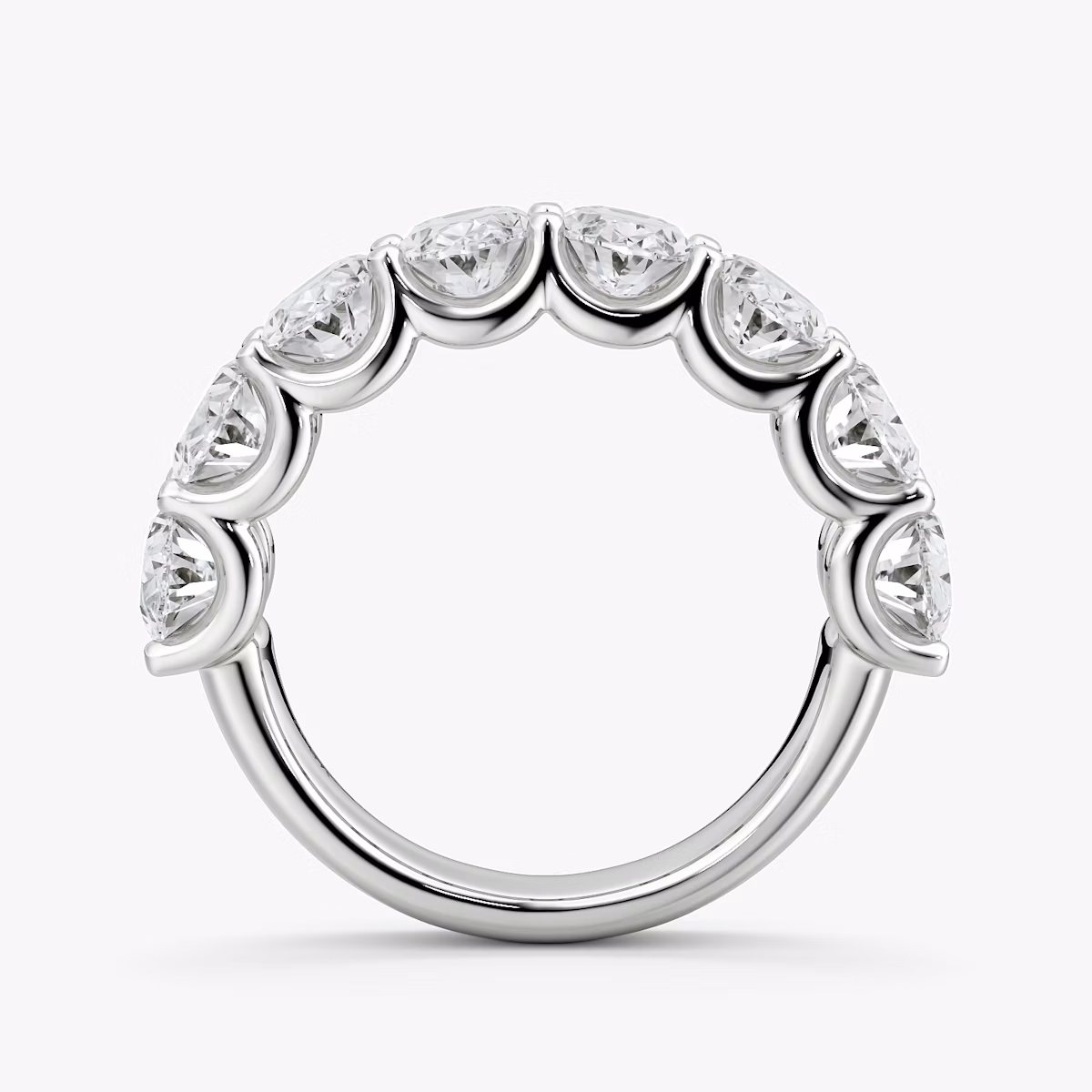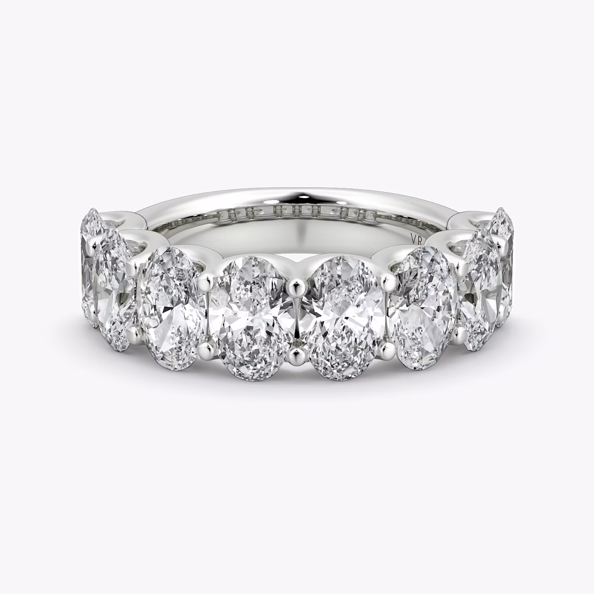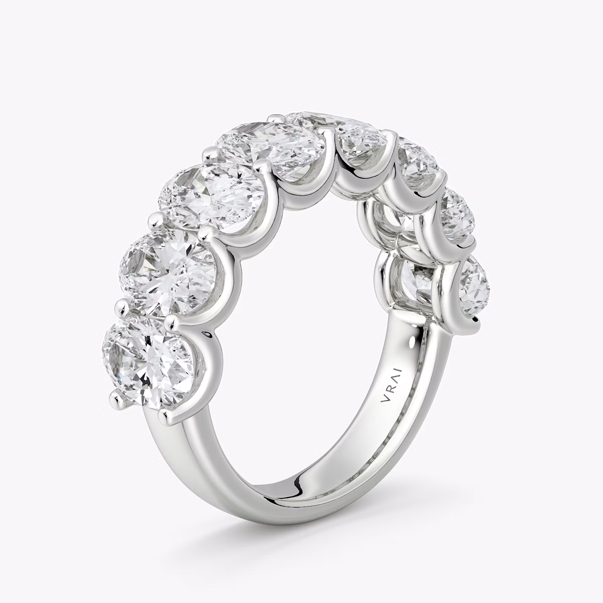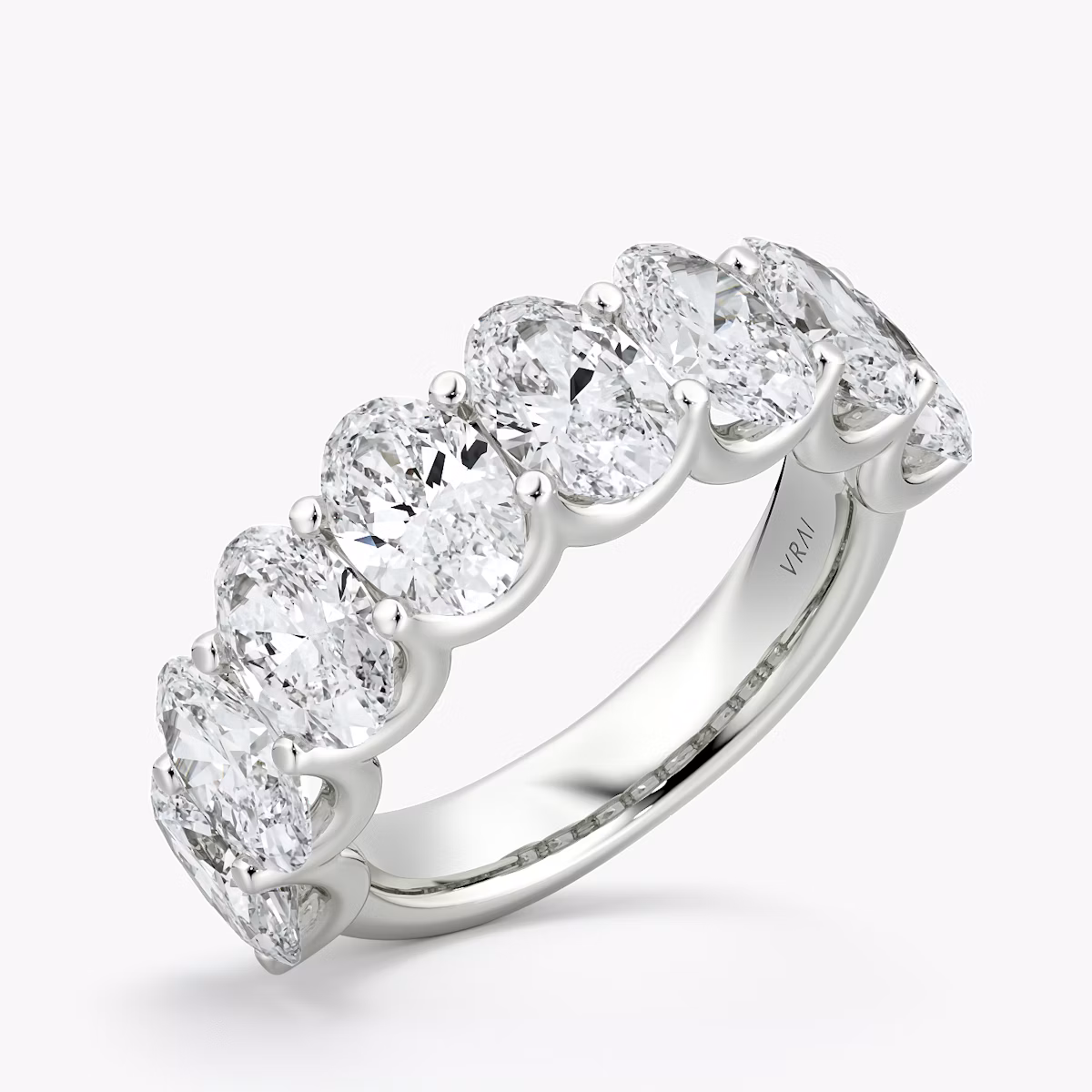 Let your love shine forever with the dazzling and symbolic Eternity Band. The Half Oval Eternity Band provides a slightly more subdued, but equally romantic, alternative to our classic design. Choose between 2.5 or 4 carats of VRAI created Oval cut diamonds that encircle half of a platinum or solid gold band. This wedding band design beautifully represents the strength of your union and your never-ending love.