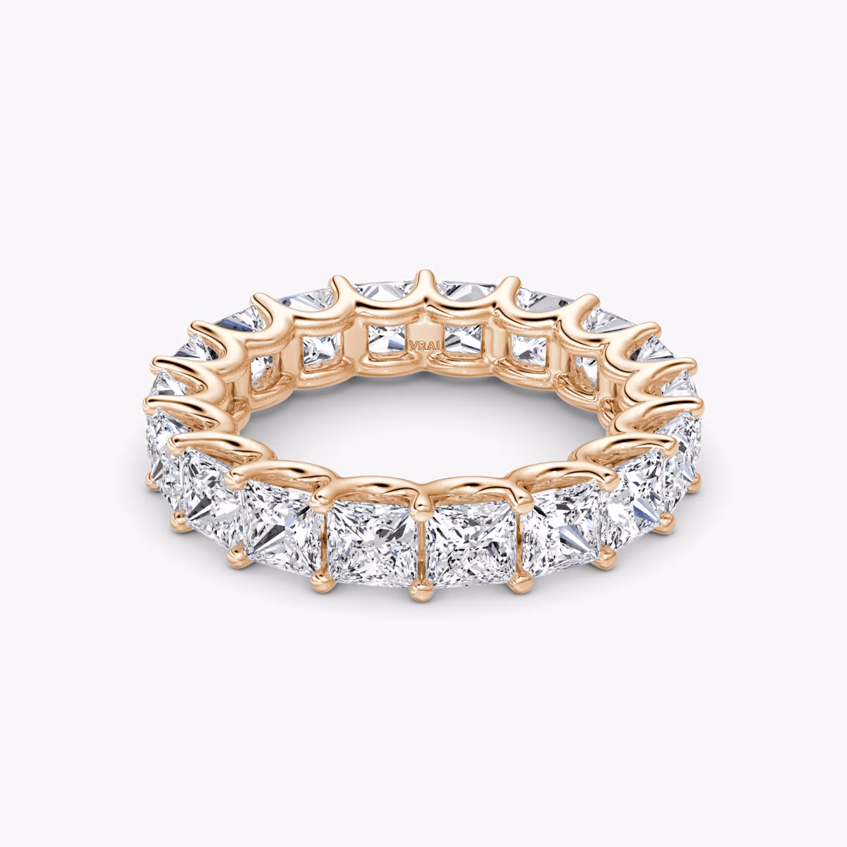 All-encompassing love. Our Eternity band fully embodies the strength of your commitment with a platinum or solid gold band featuring your chosen VRAI created diamond shape. The minimal u-prong setting is designed to draw in the light so each diamond shines bright. Commemorate an eternity of love and union with a wedding band designed to last a lifetime. Choose between a half or full VRAI created diamond eternity band.