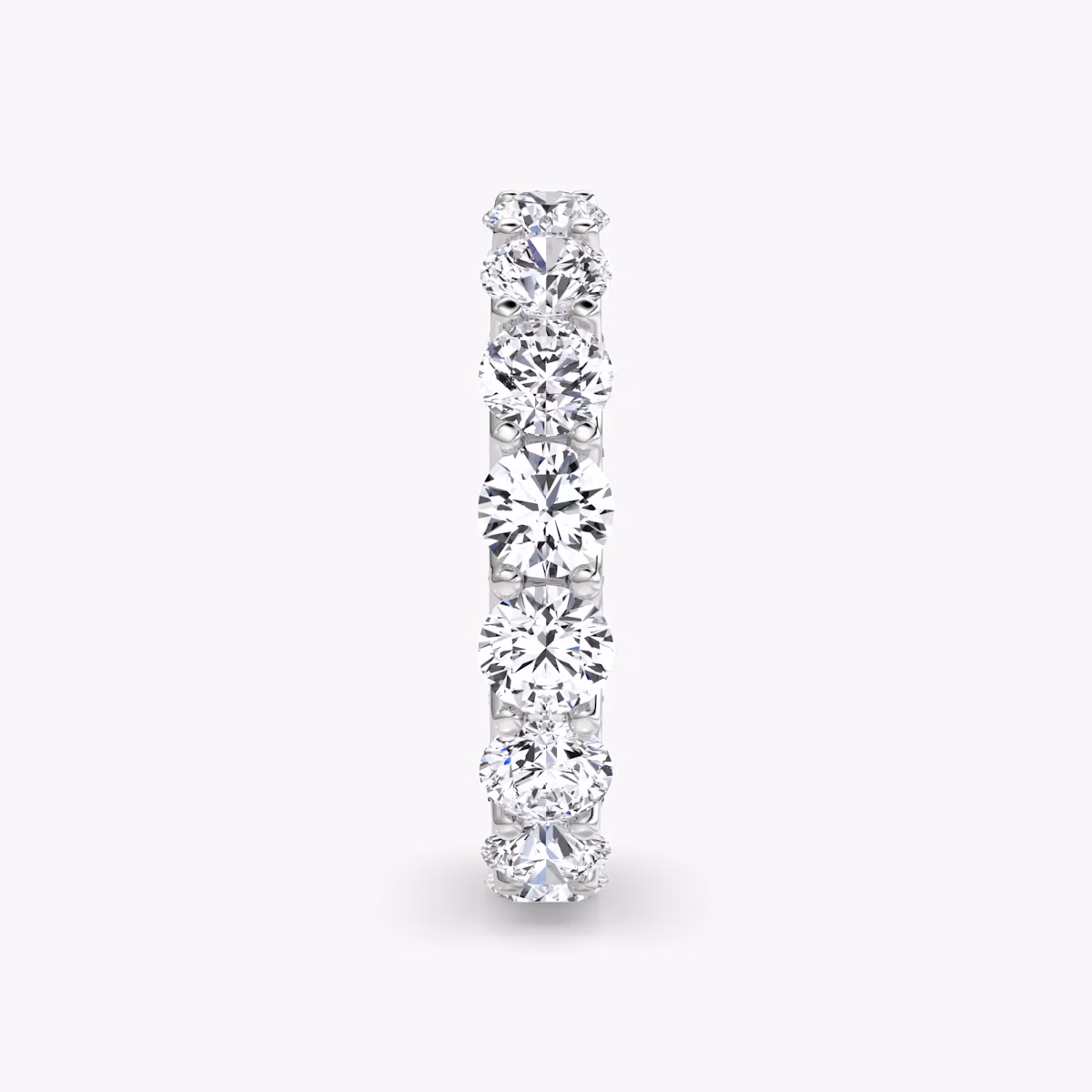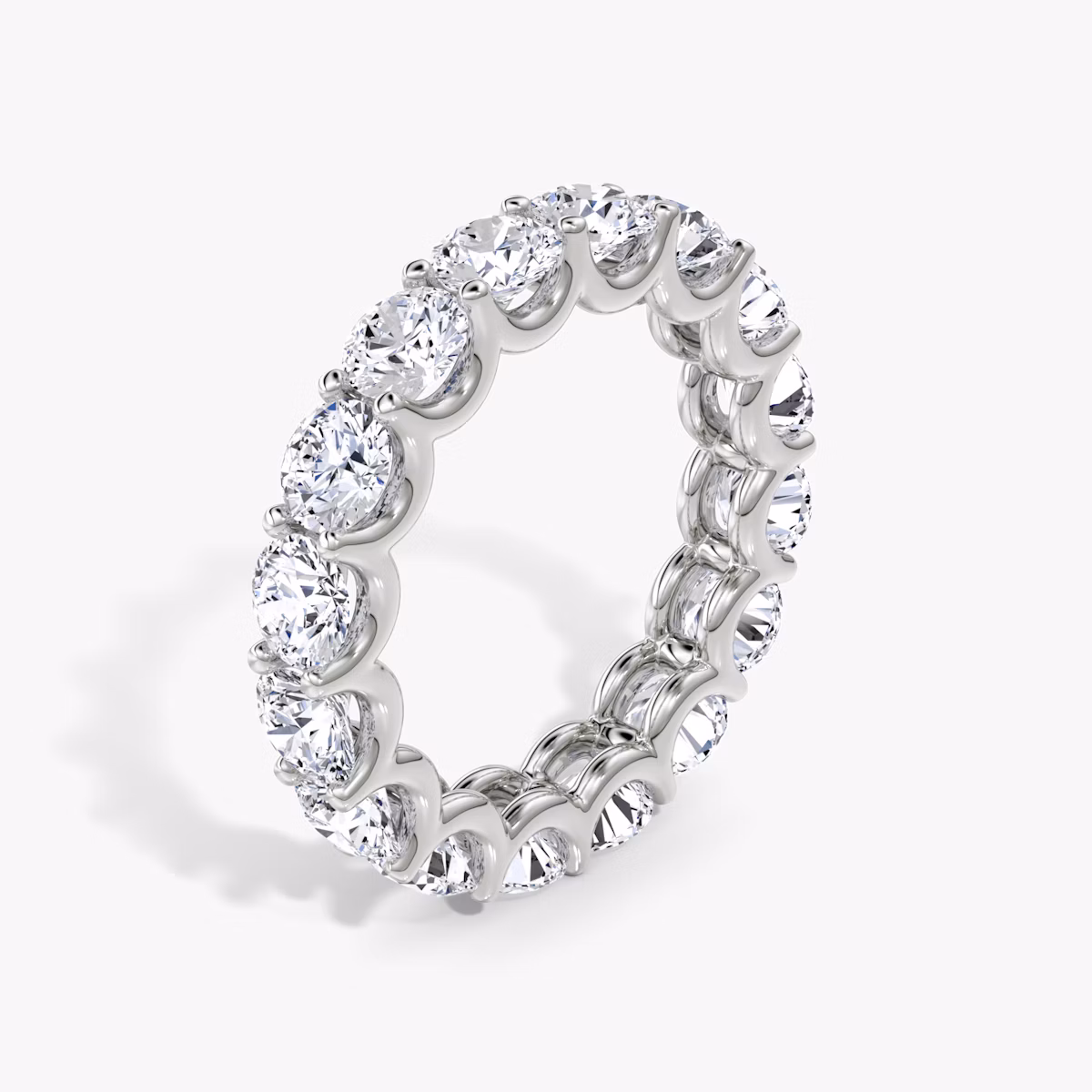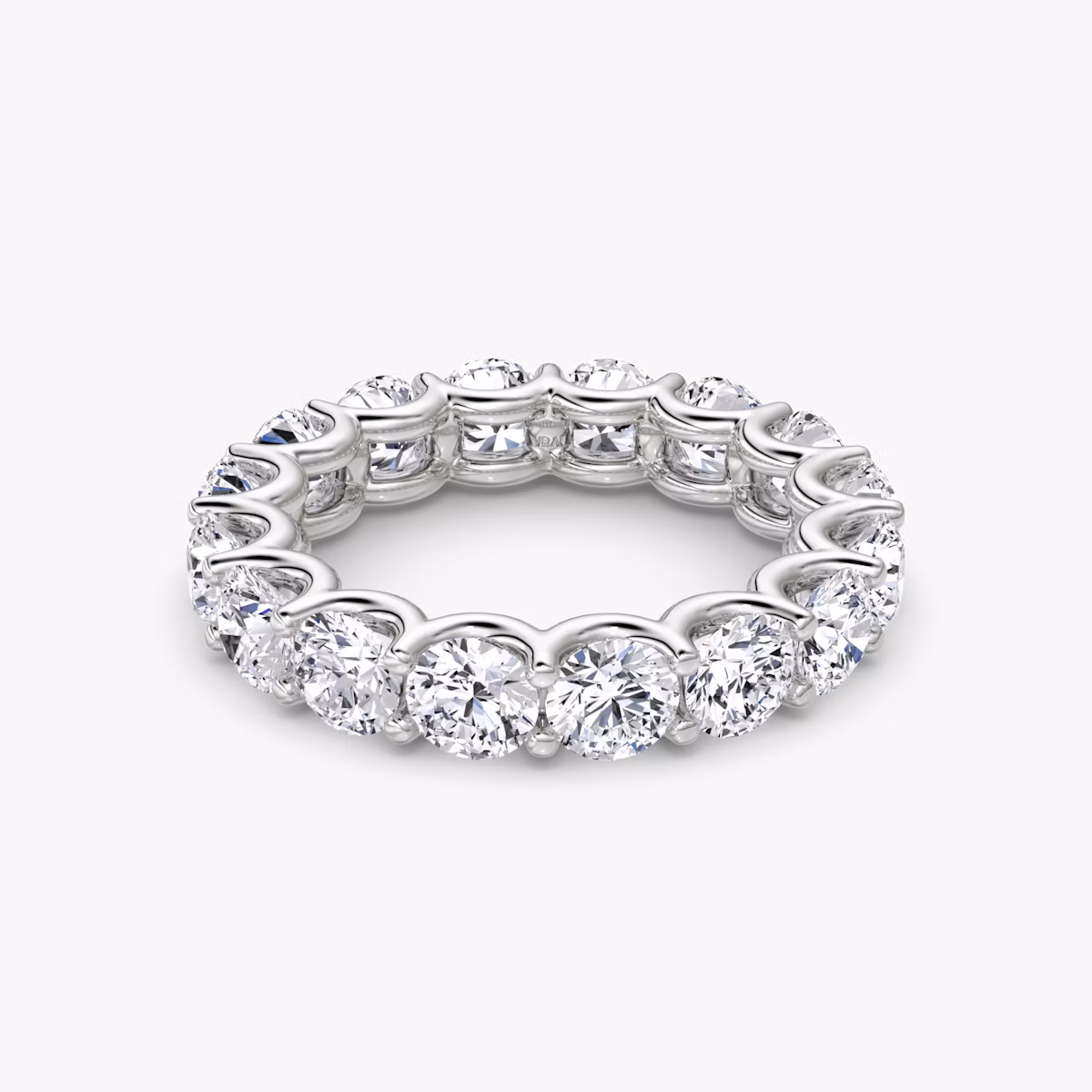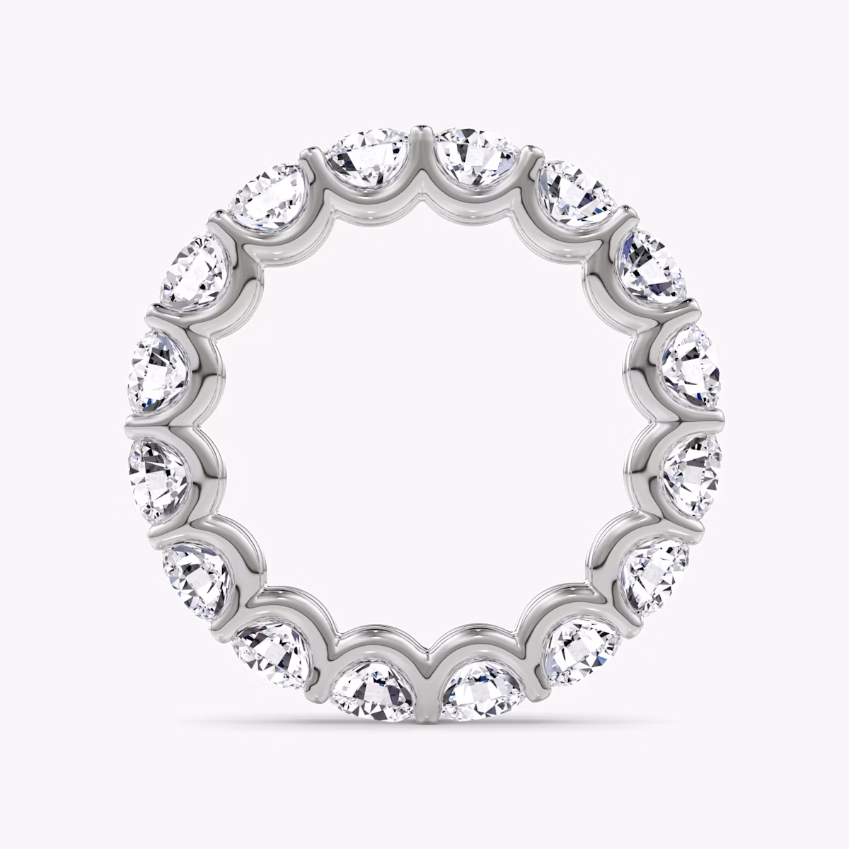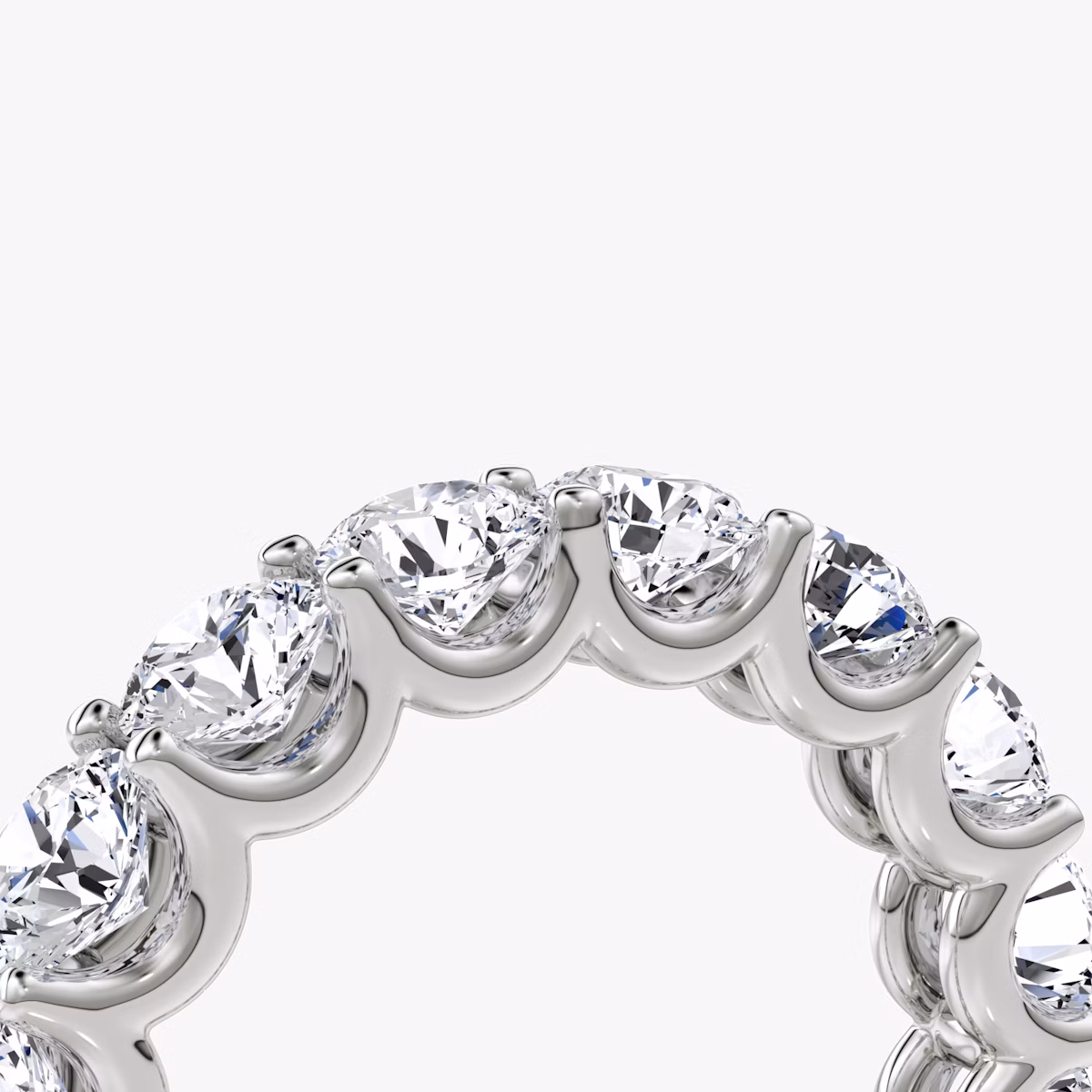 All-encompassing love. Our Eternity band fully embodies the strength of your commitment with a platinum or solid gold band featuring your chosen VRAI created diamond shape. The minimal u-prong setting is designed to draw in the light so each diamond shines bright. Commemorate an eternity of love and union with a wedding band designed to last a lifetime. Choose between a half or full VRAI created diamond eternity band.
