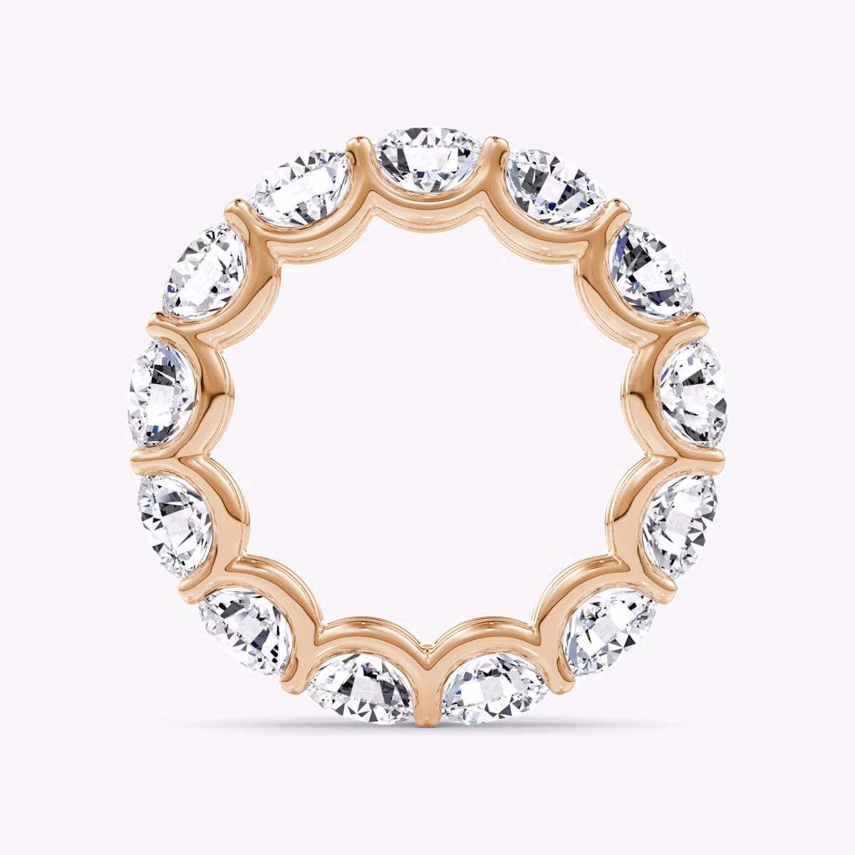 All-encompassing love. Our Eternity band fully embodies the strength of your commitment with a platinum or solid gold band featuring your chosen VRAI created diamond shape. The minimal u-prong setting is designed to draw in the light so each diamond shines bright. Commemorate an eternity of love and union with a wedding band designed to last a lifetime. Choose between a half or full VRAI created diamond eternity band.