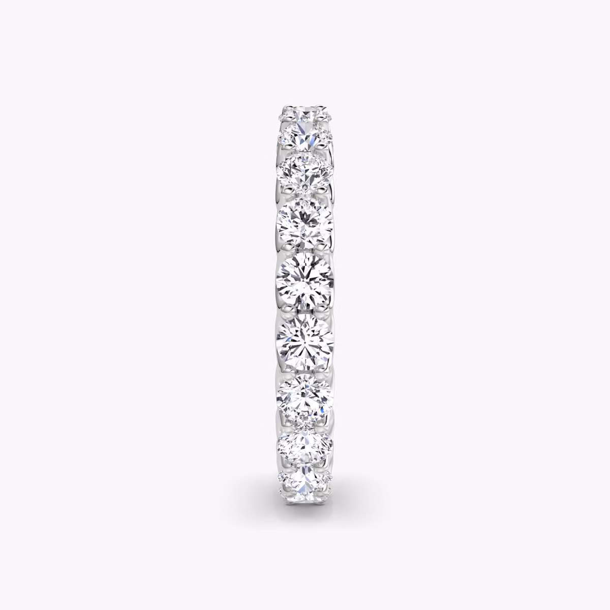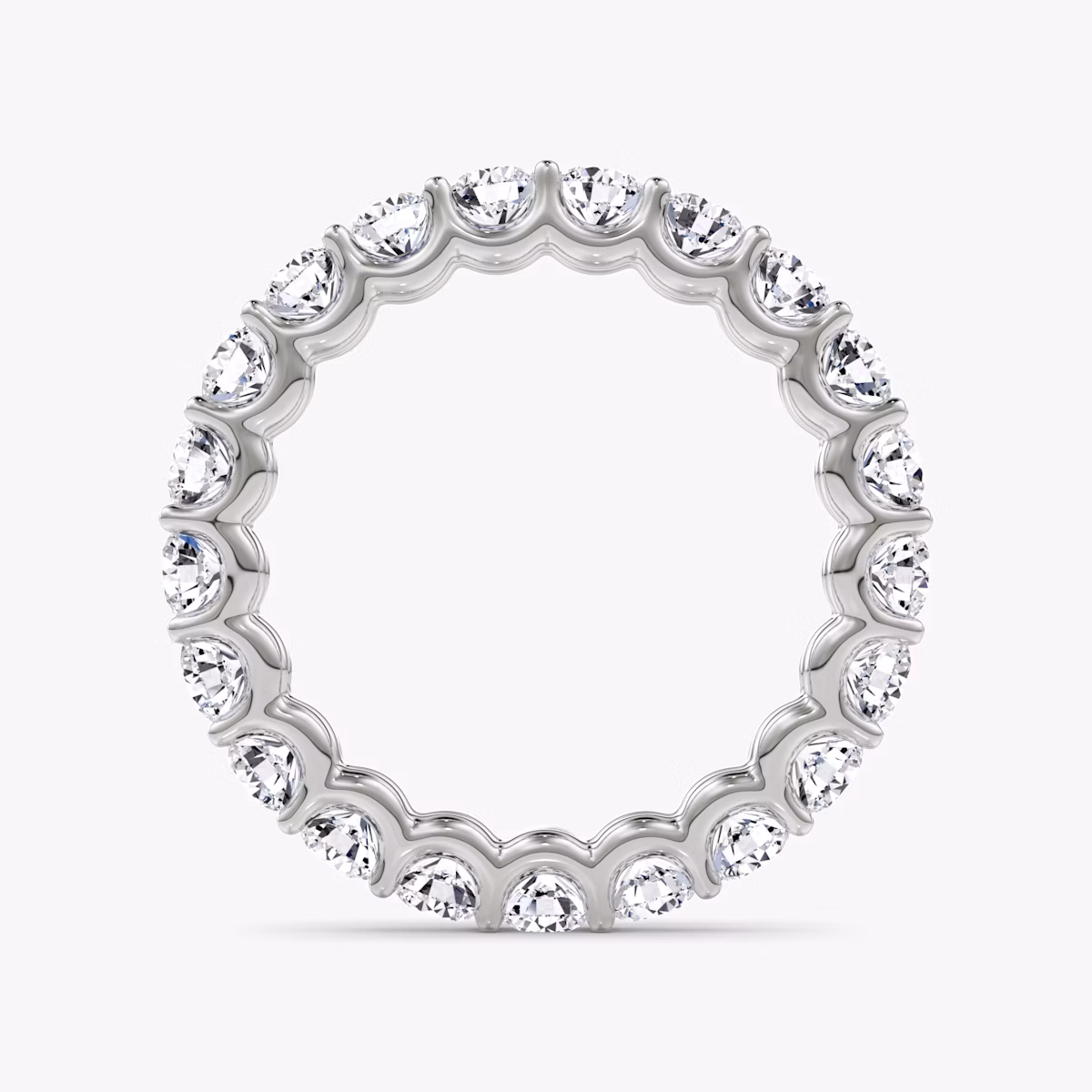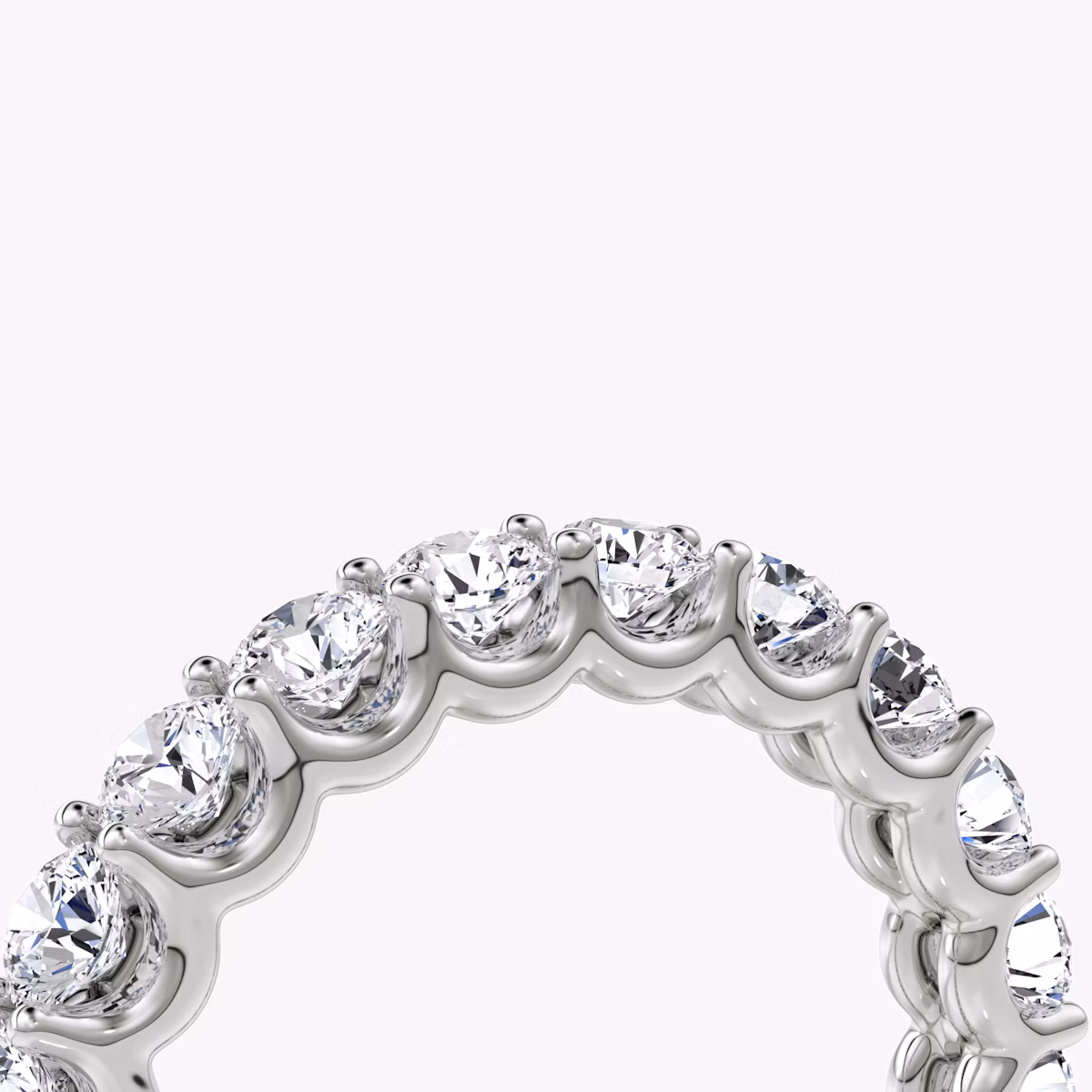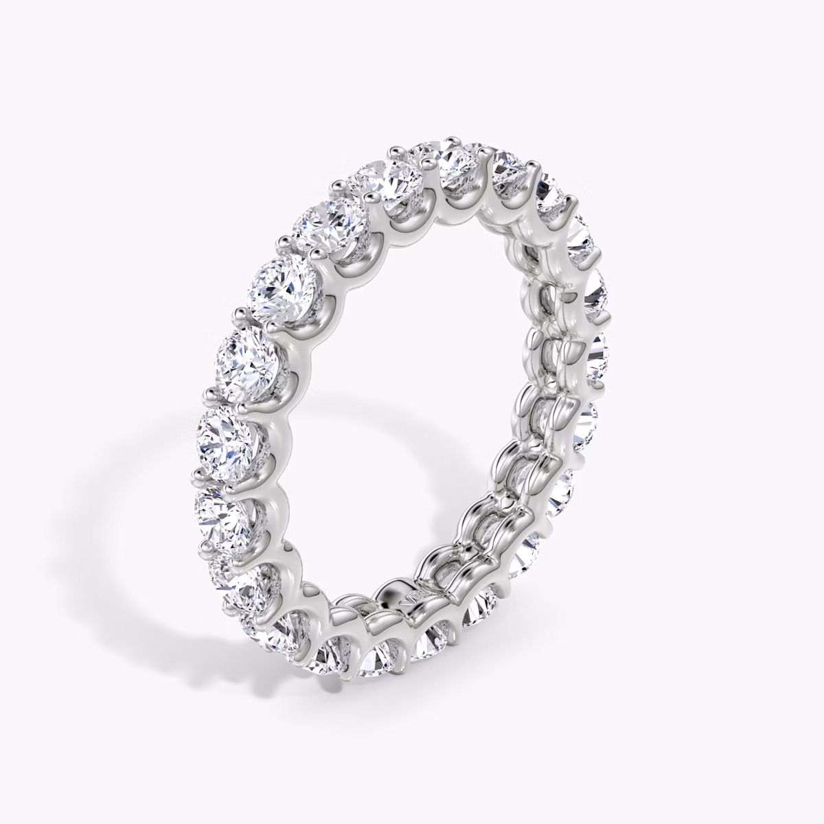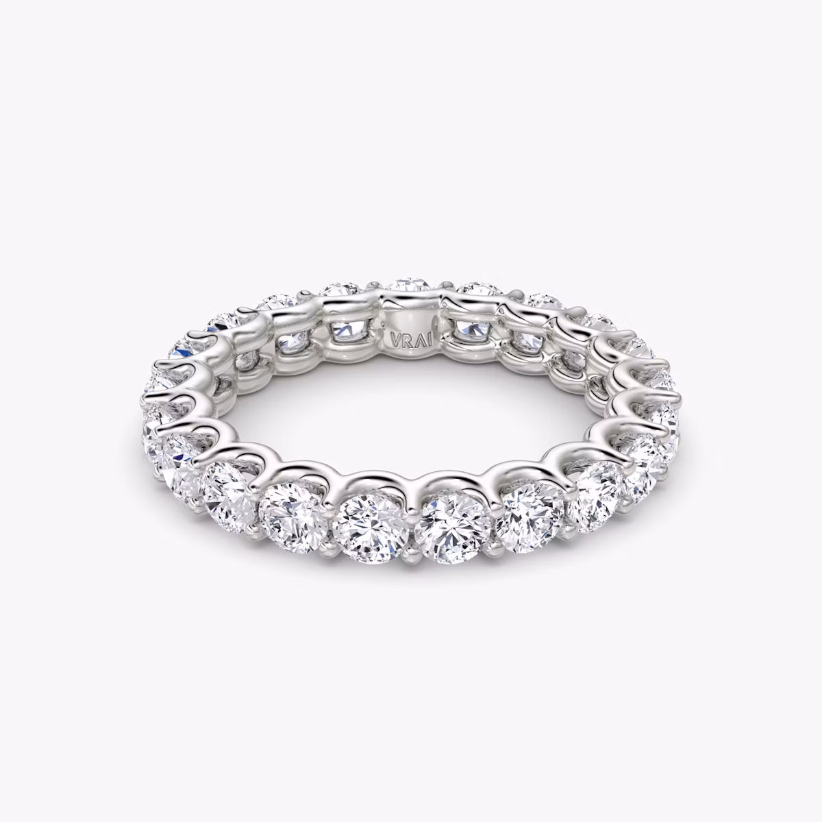 All-encompassing love. Our Eternity band fully embodies the strength of your commitment with a platinum or solid gold band featuring your chosen VRAI created diamond shape. The minimal u-prong setting is designed to draw in the light so each diamond shines bright. Commemorate an eternity of love and union with a wedding band designed to last a lifetime. Choose between a half or full VRAI created diamond eternity band.