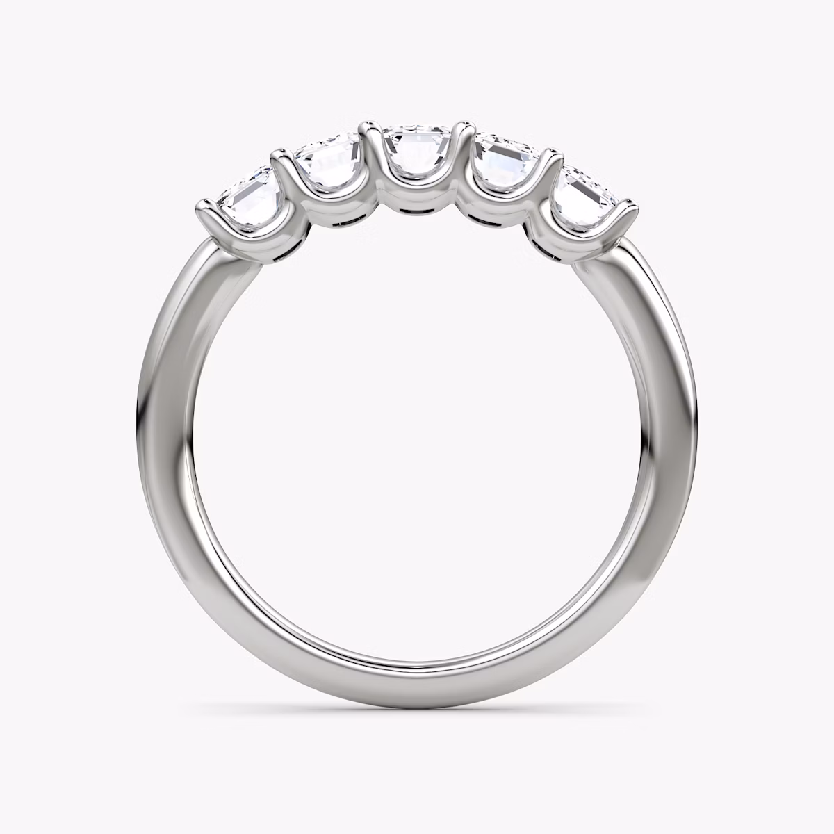 A dazzling row of five VRAI created diamonds are secured atop a solid gold or platinum setting, creating a bold display of brilliance and symmetry. Highlighting one of six different diamond shapes, the substantial and sophisticated Five Stone band symbolizes the memories, milestones, and moments worth celebrating.