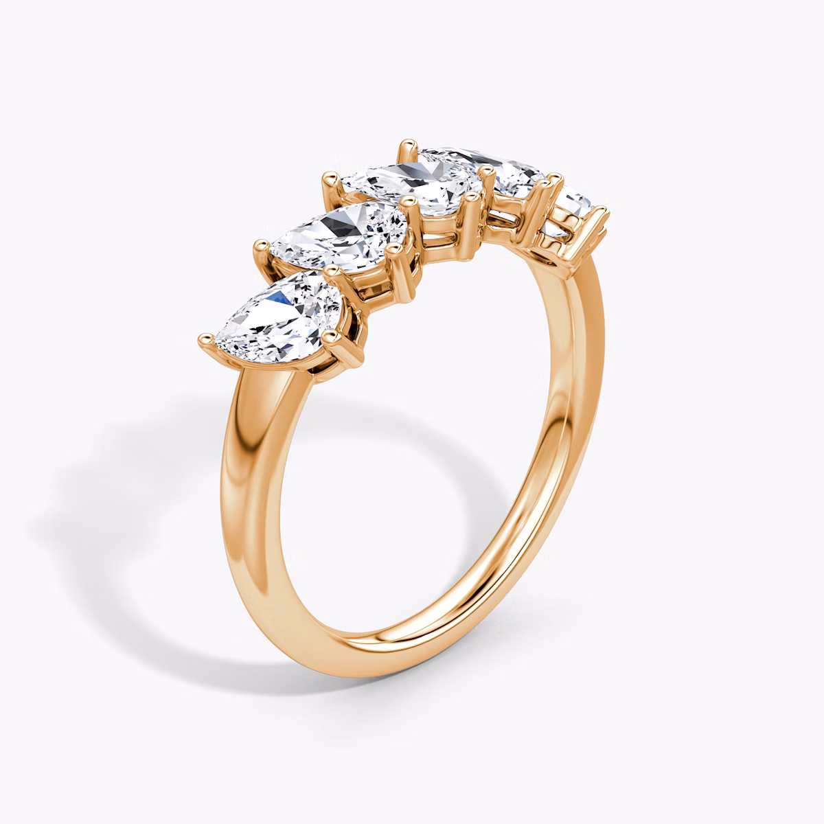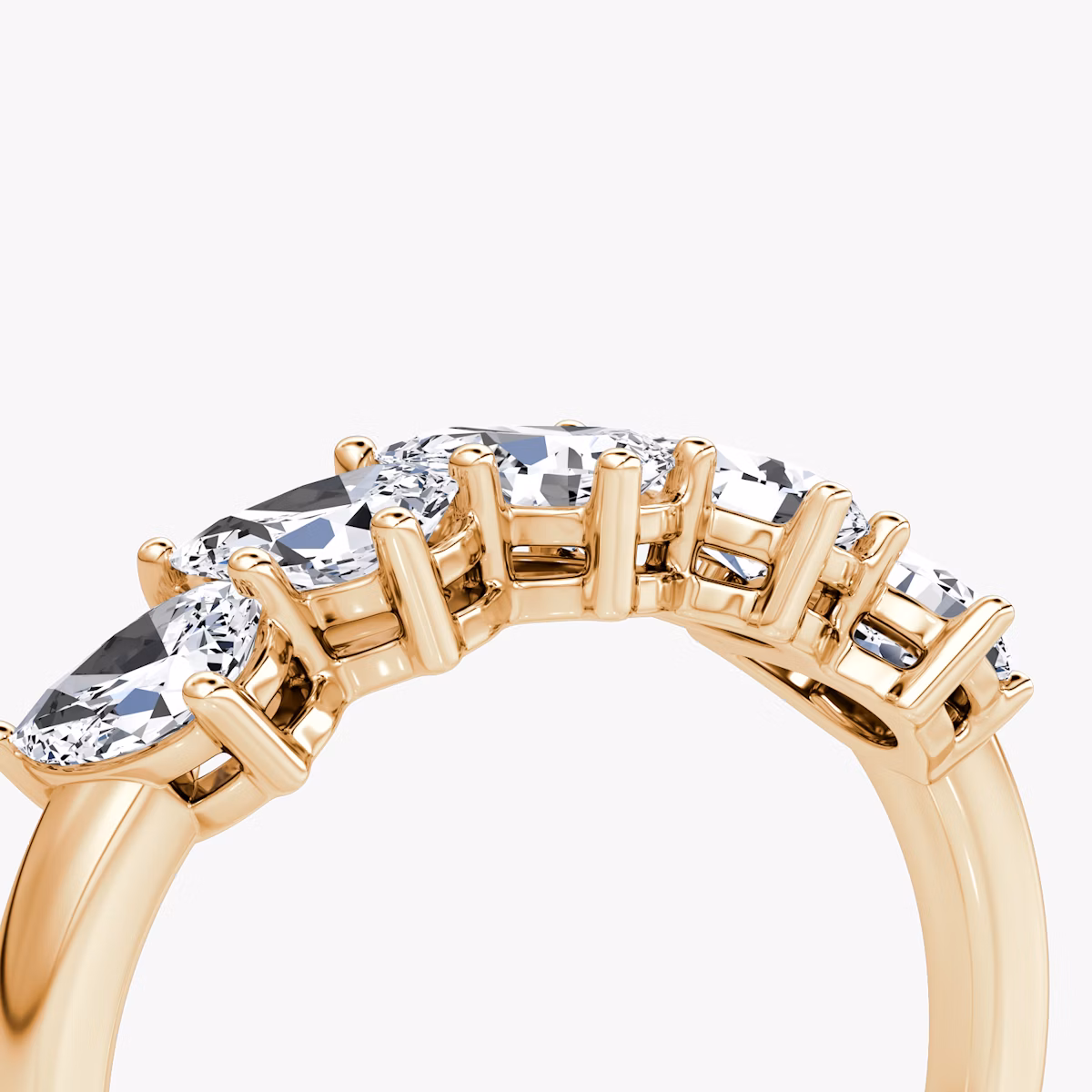 A dazzling row of five VRAI created diamonds are secured atop a solid gold or platinum setting, creating a bold display of brilliance and symmetry. Highlighting one of six different diamond shapes, the substantial and sophisticated Five Stone band symbolizes the memories, milestones, and moments worth celebrating.