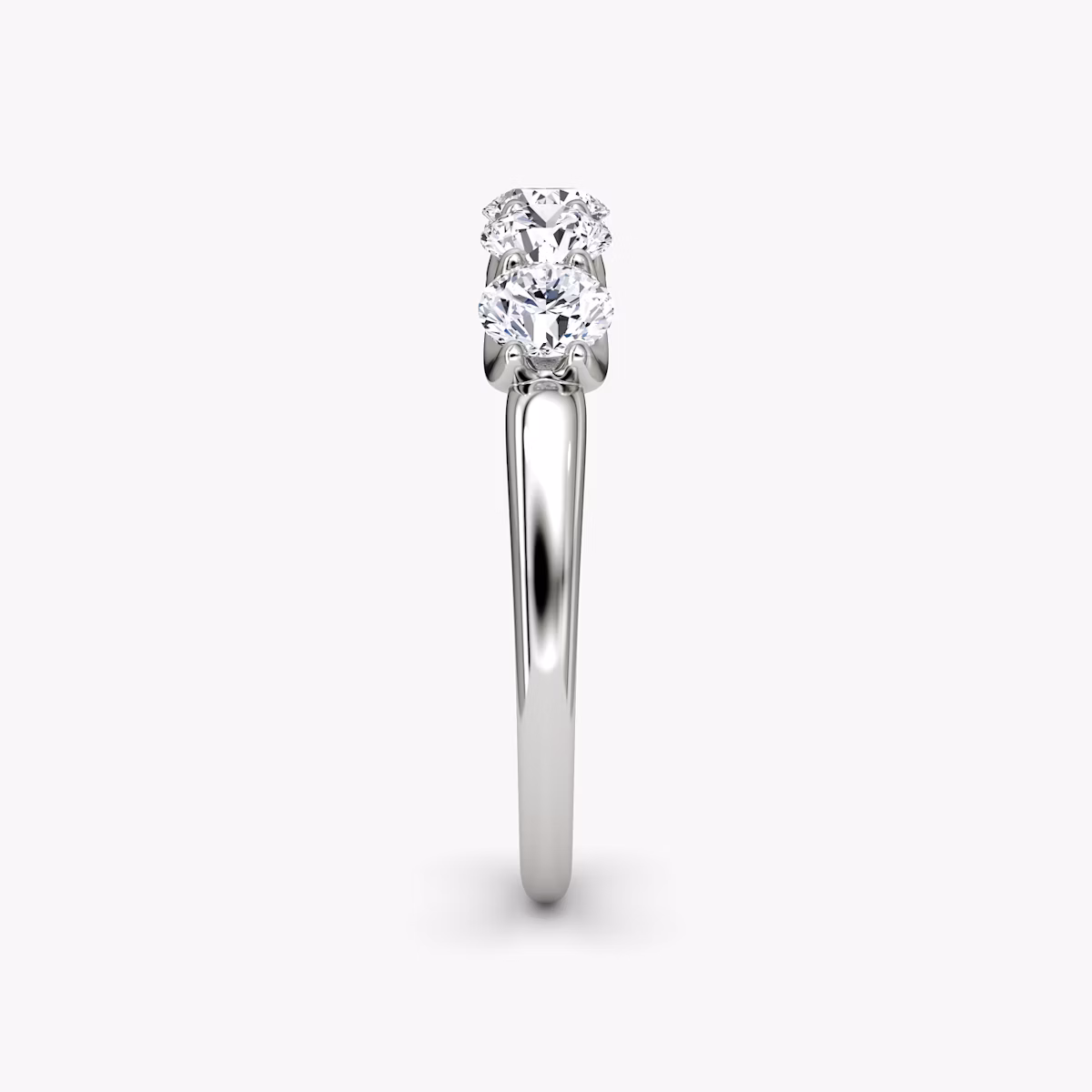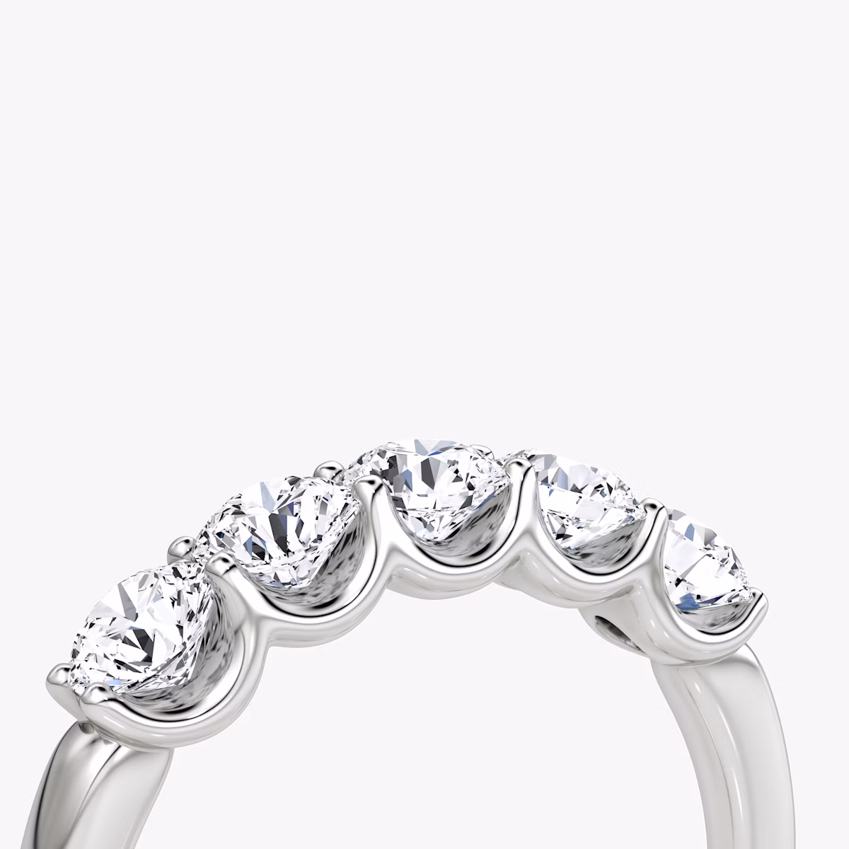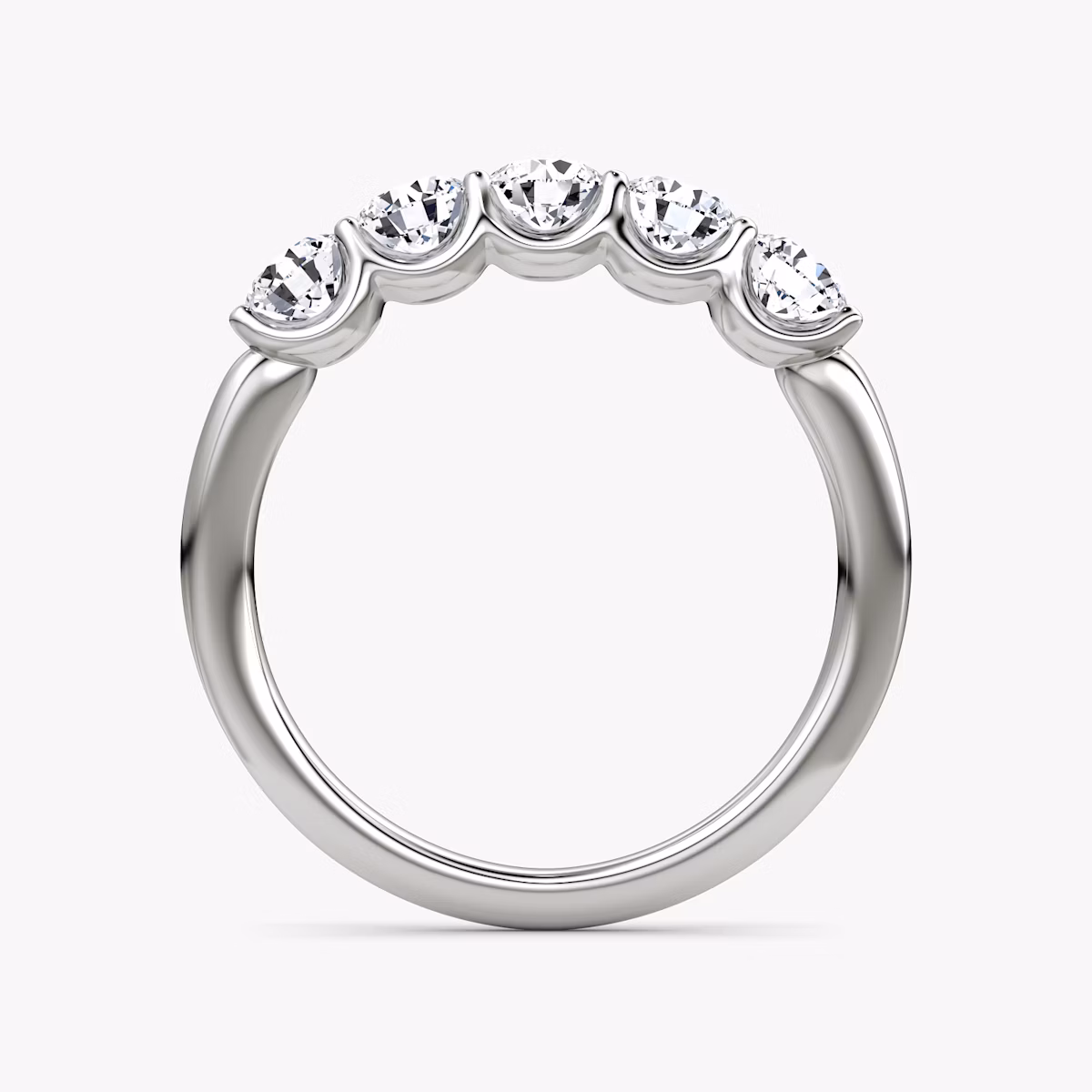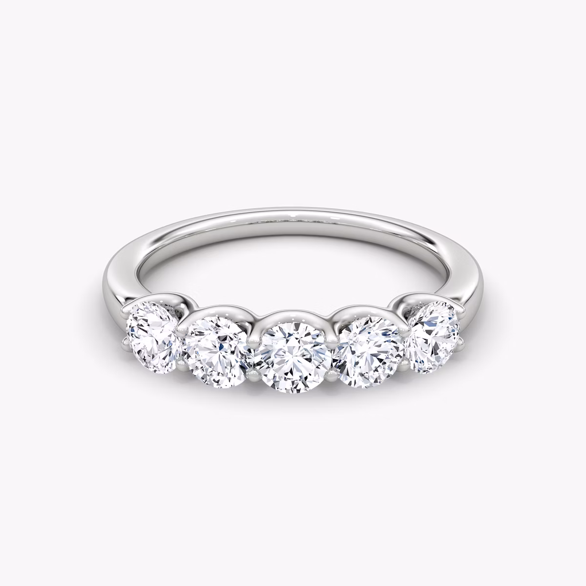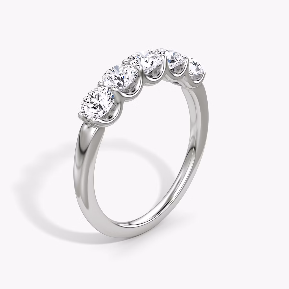 A dazzling row of five VRAI created diamonds are secured atop a solid gold or platinum setting, creating a bold display of brilliance and symmetry. Highlighting one of six different diamond shapes, the substantial and sophisticated Five Stone band symbolizes the memories, milestones, and moments worth celebrating.