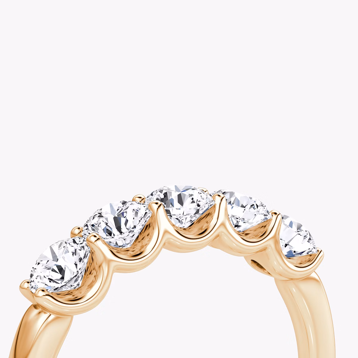 A dazzling row of five VRAI created diamonds are secured atop a solid gold or platinum setting, creating a bold display of brilliance and symmetry. Highlighting one of six different diamond shapes, the substantial and sophisticated Five Stone band symbolizes the memories, milestones, and moments worth celebrating.